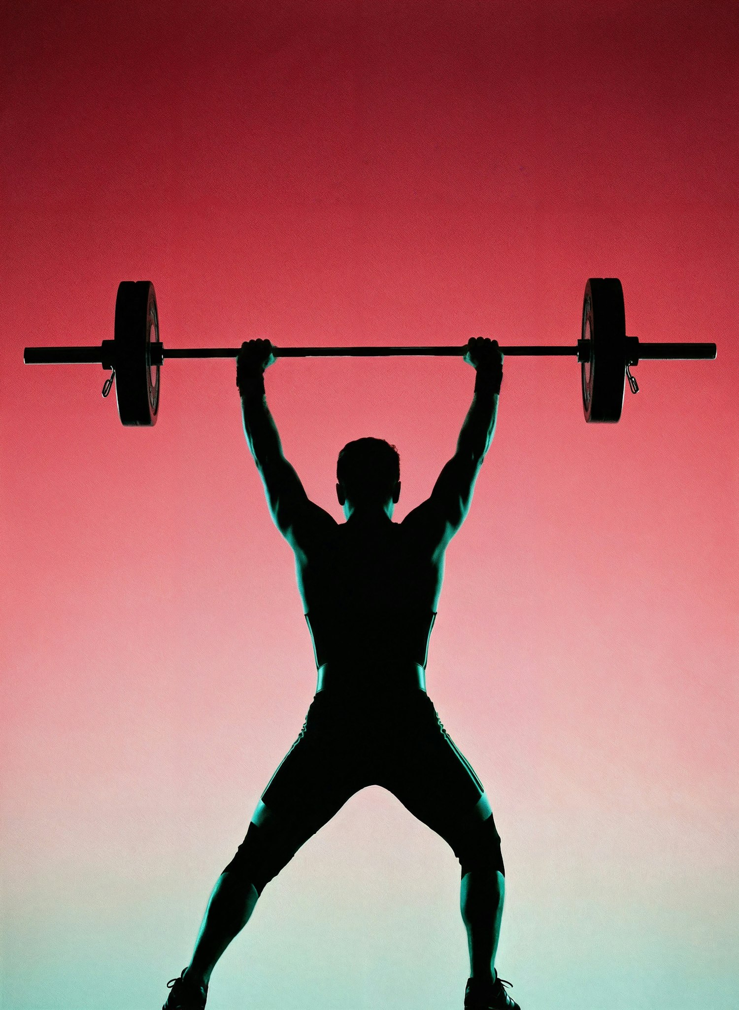 Silhouette of a person lifting a barbell overhead against a striking red-to-pink gradient background, showcasing strength and balance.