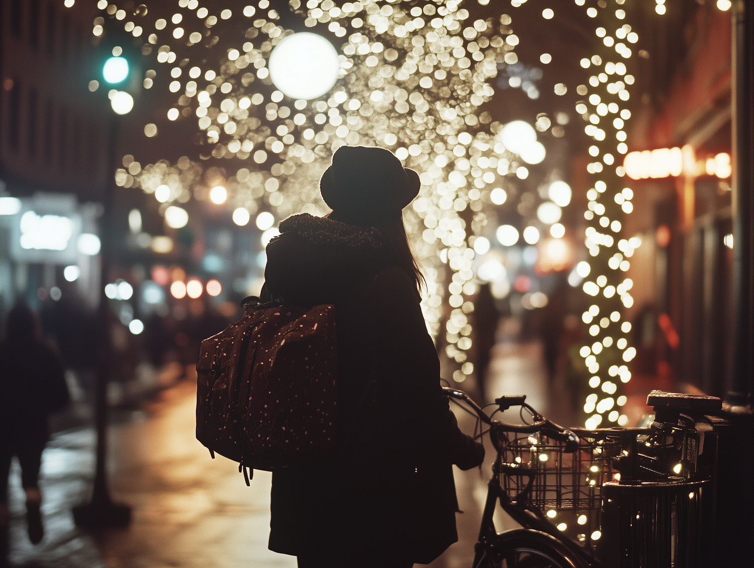 Silhouette of a person with a backpack next to a bicycle on a festive, light-adorned street at night.