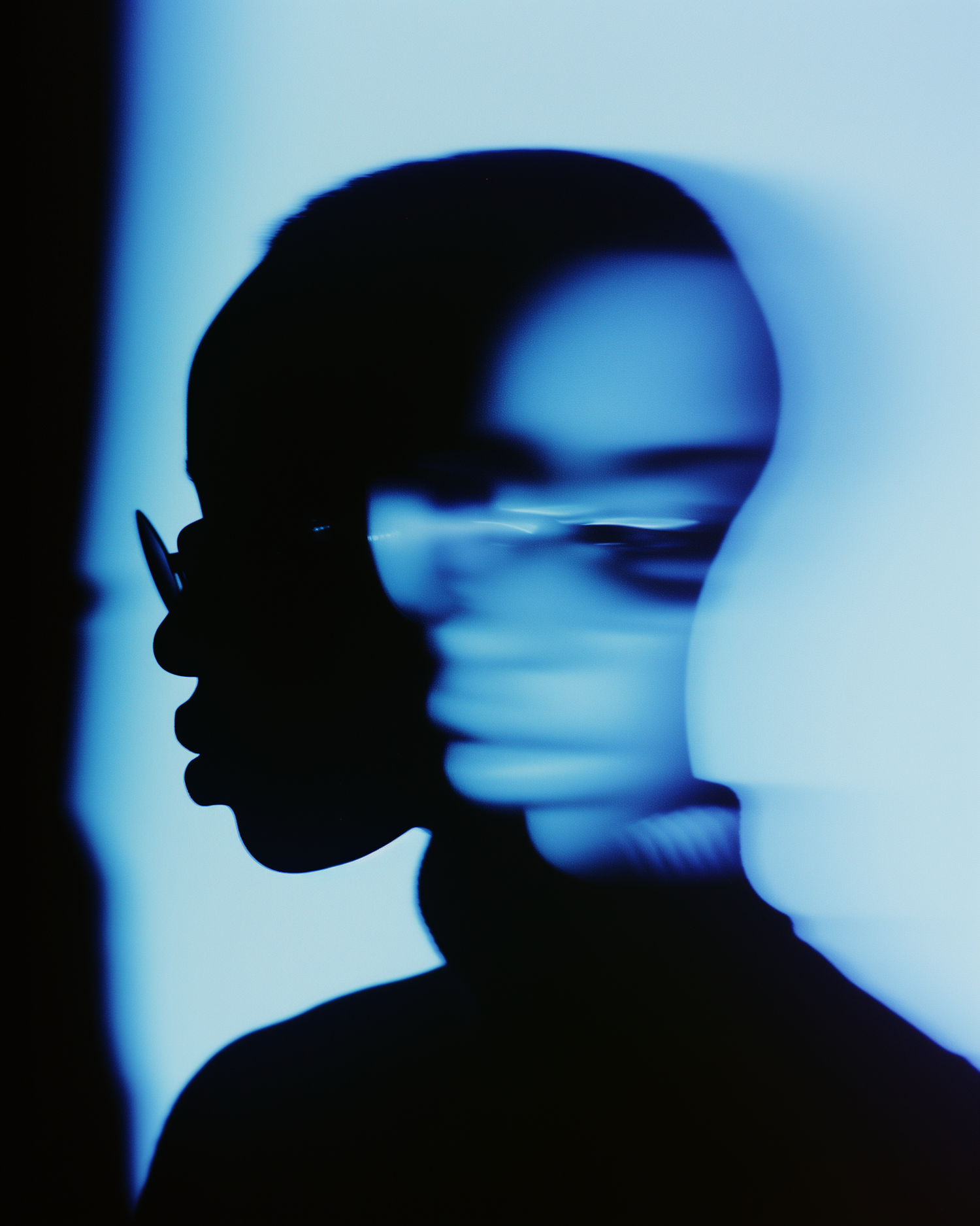 Abstract silhouette with double exposure effect, featuring a dark-skinned profile against a gradient blue background. Surreal and minimalistic.