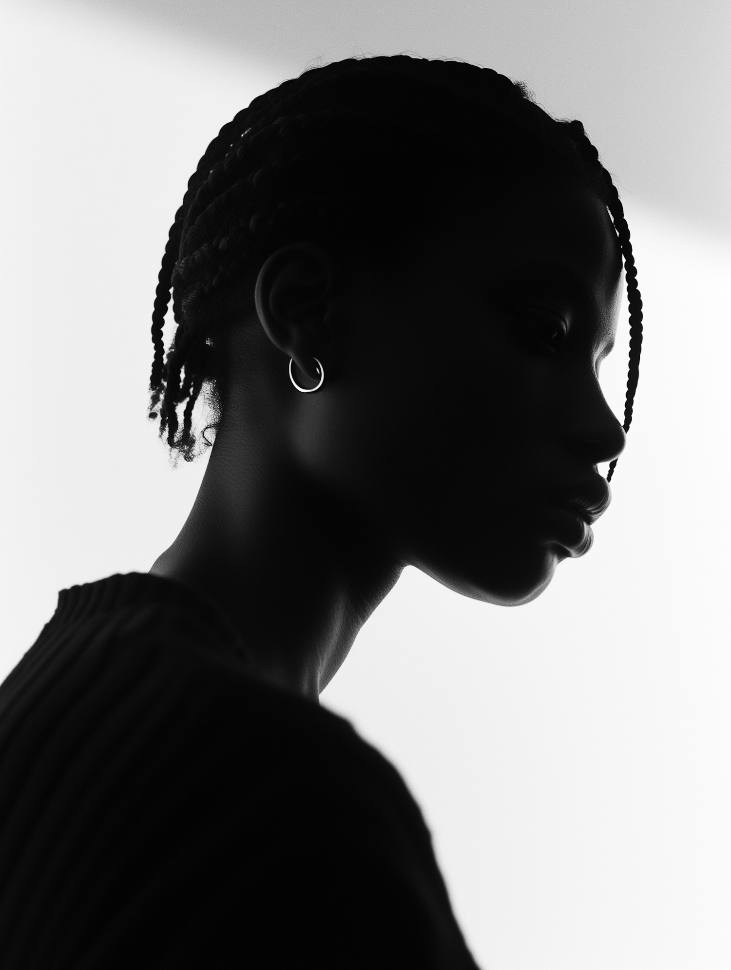 Elegant black and white silhouette portrait of a person with braided hair and hoop earring, highlighting facial contours.