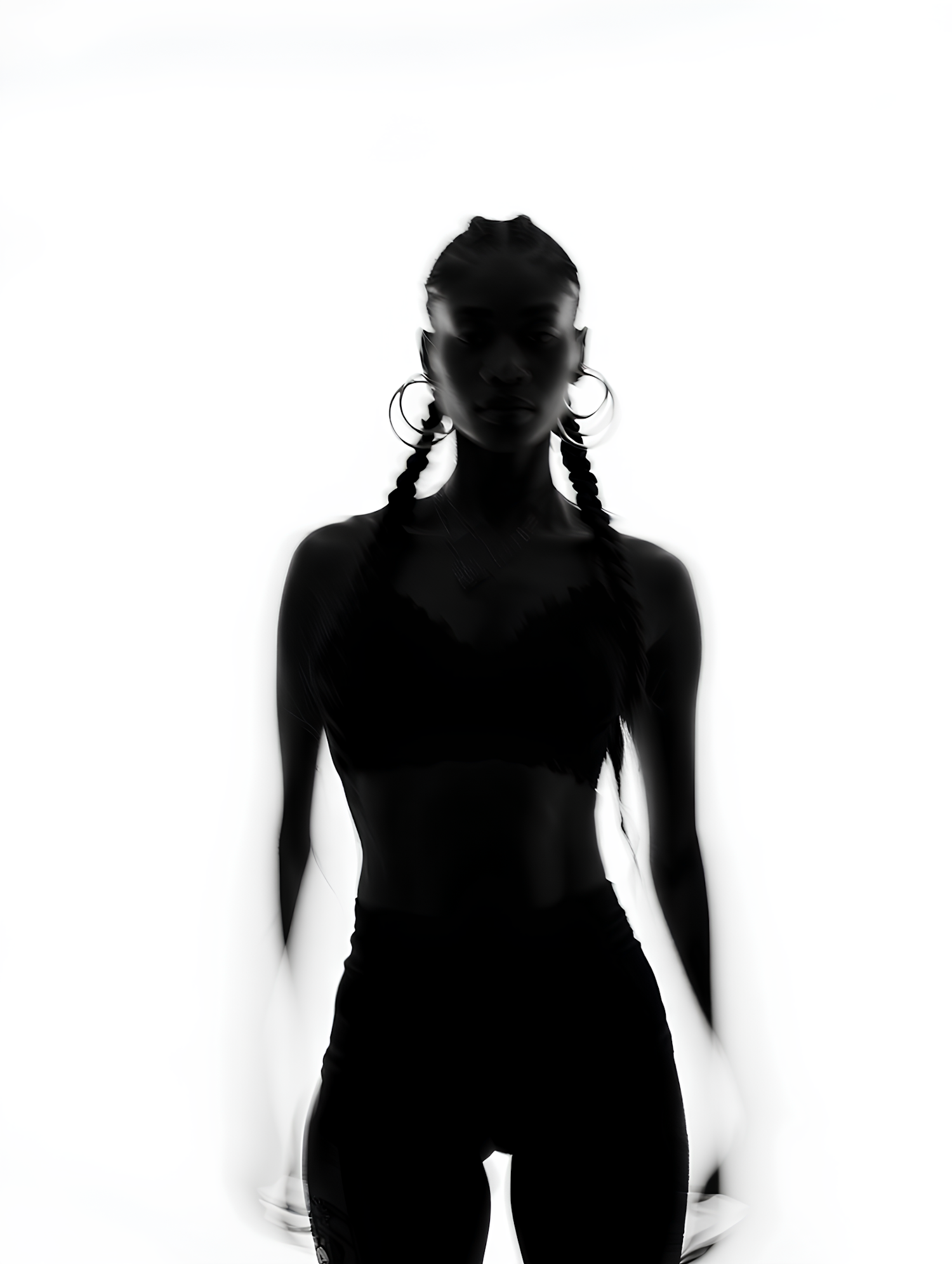 Silhouette of a woman with braided hair, hoop earrings, and a fitted outfit against a bright white background. Minimalist and striking.