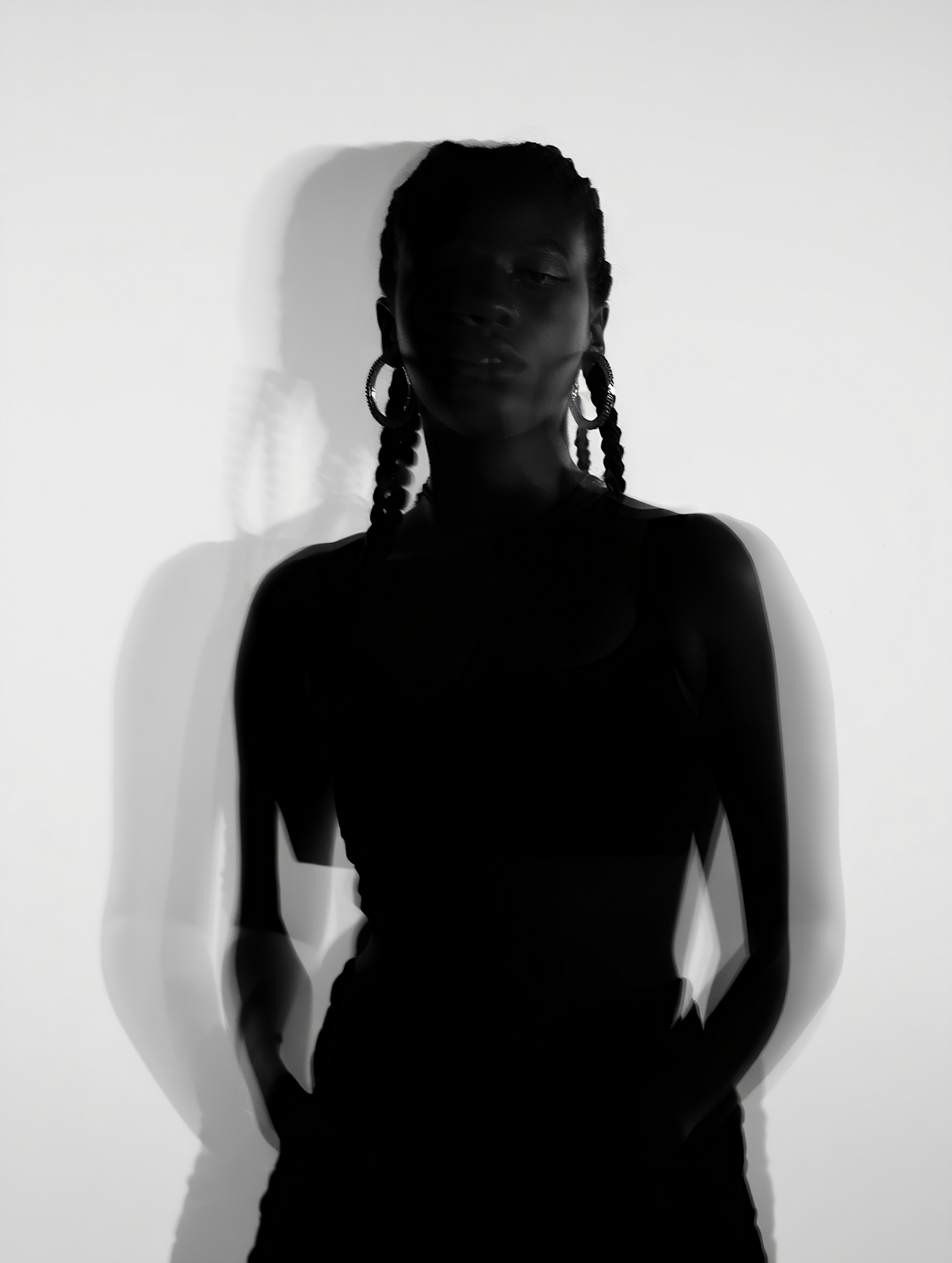 Silhouette of a woman with braids and hoop earrings, captured with a double-exposure effect against a white background.