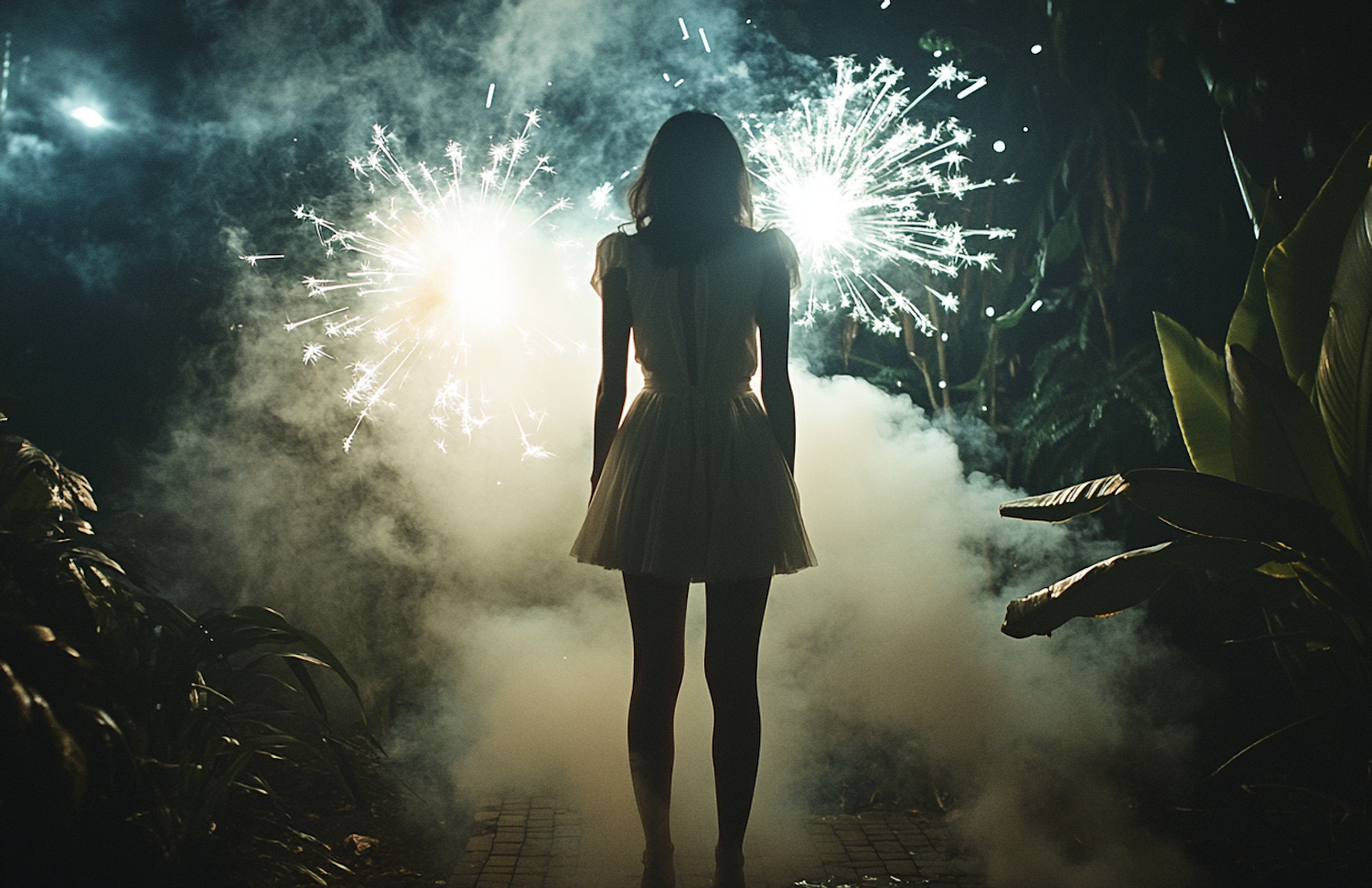 Silhouette of a woman in a dress with fireworks and smoke in the background, creating a dramatic night scene.