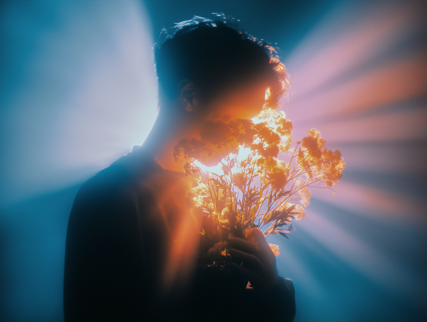 Silhouette of a person holding glowing yellow flowers, backlit by dramatic blue and orange light beams, creating a dreamy atmosphere.