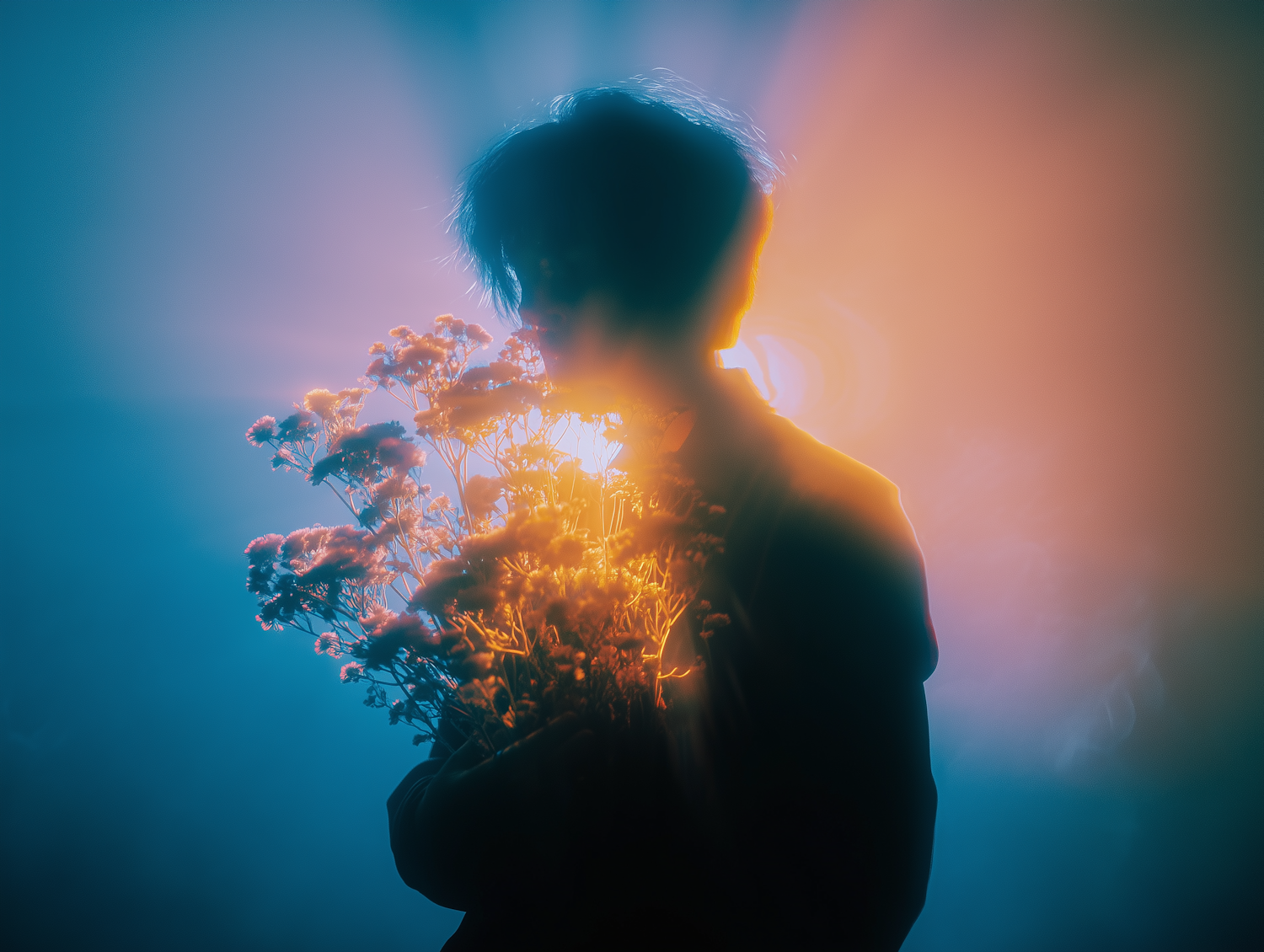 Silhouette of a person holding flowers, bathed in dramatic blue and orange lighting, creating a dreamy and ethereal atmosphere.