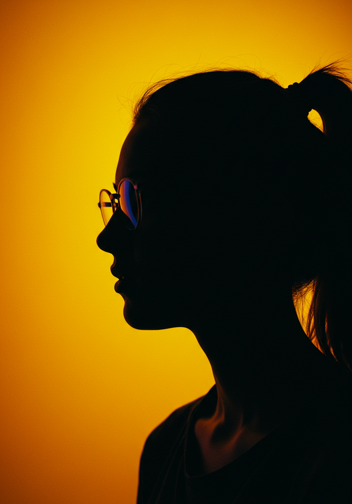 Silhouette of a person with glasses and a ponytail against a bold yellow background, creating a striking and minimalist profile view.