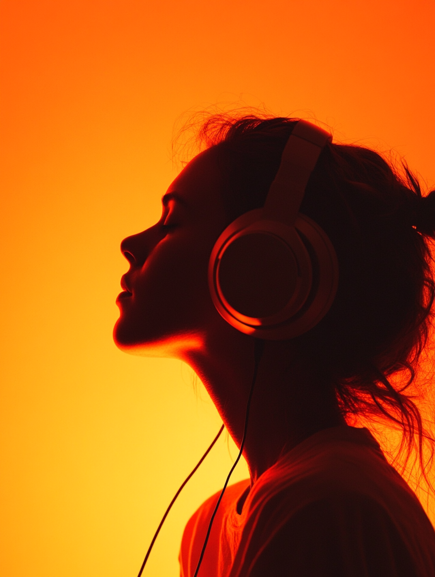 Silhouette of a woman with headphones against a glowing orange background, enjoying music with a serene and relaxed expression.
