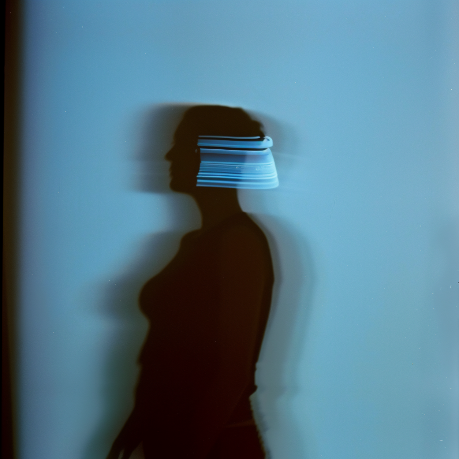 Abstract silhouette of a person with motion blur light streaks around the head, set against a soft blue background.