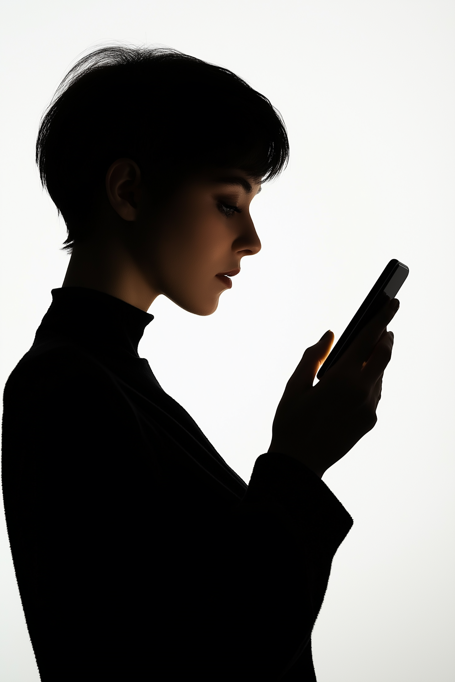 Silhouette of a person with short hair engrossed in their smartphone, set against a bright white background for a minimalist vibe.