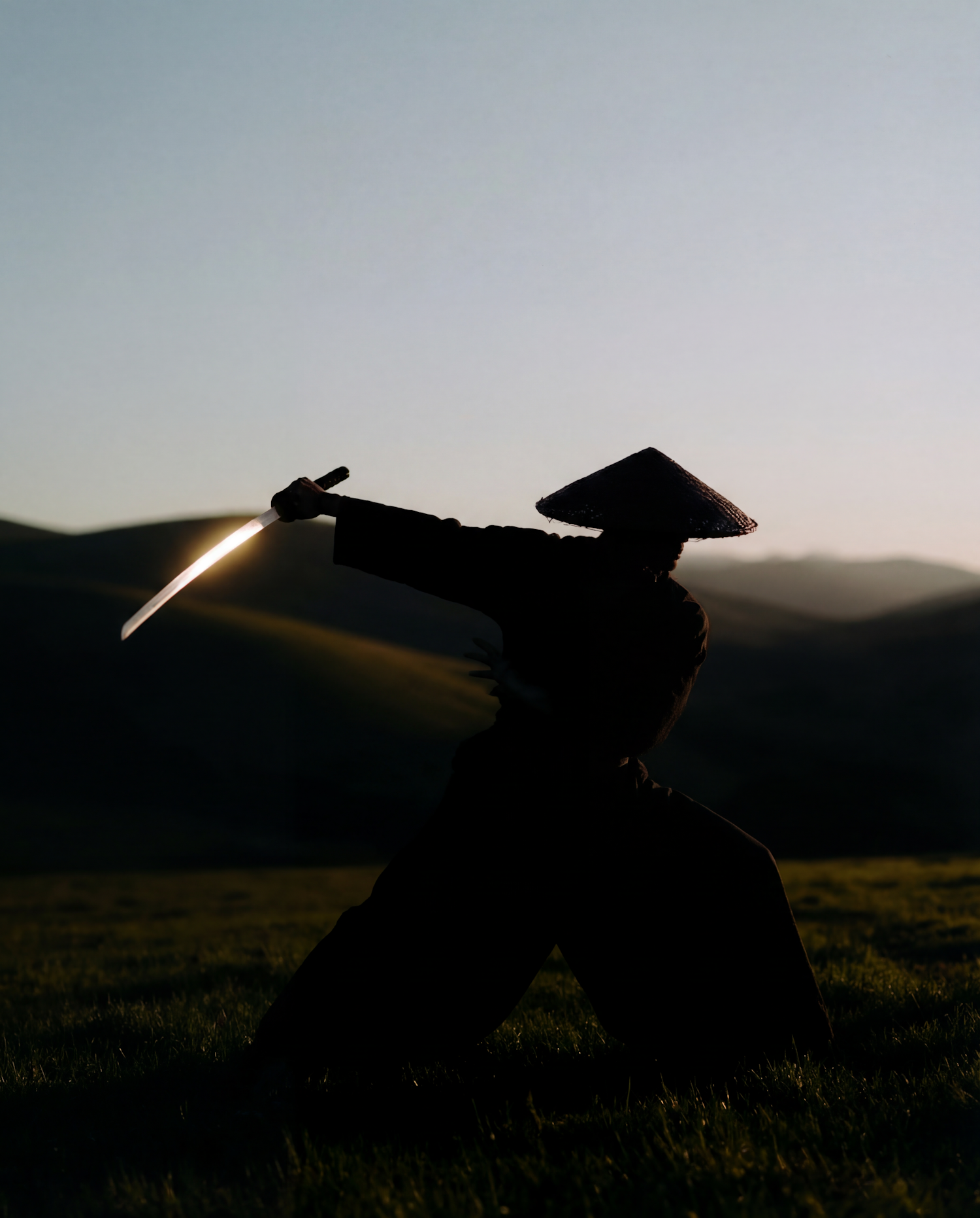Silhouette of a person in traditional attire holding a sword, set against a serene landscape of hills and a clear sky.