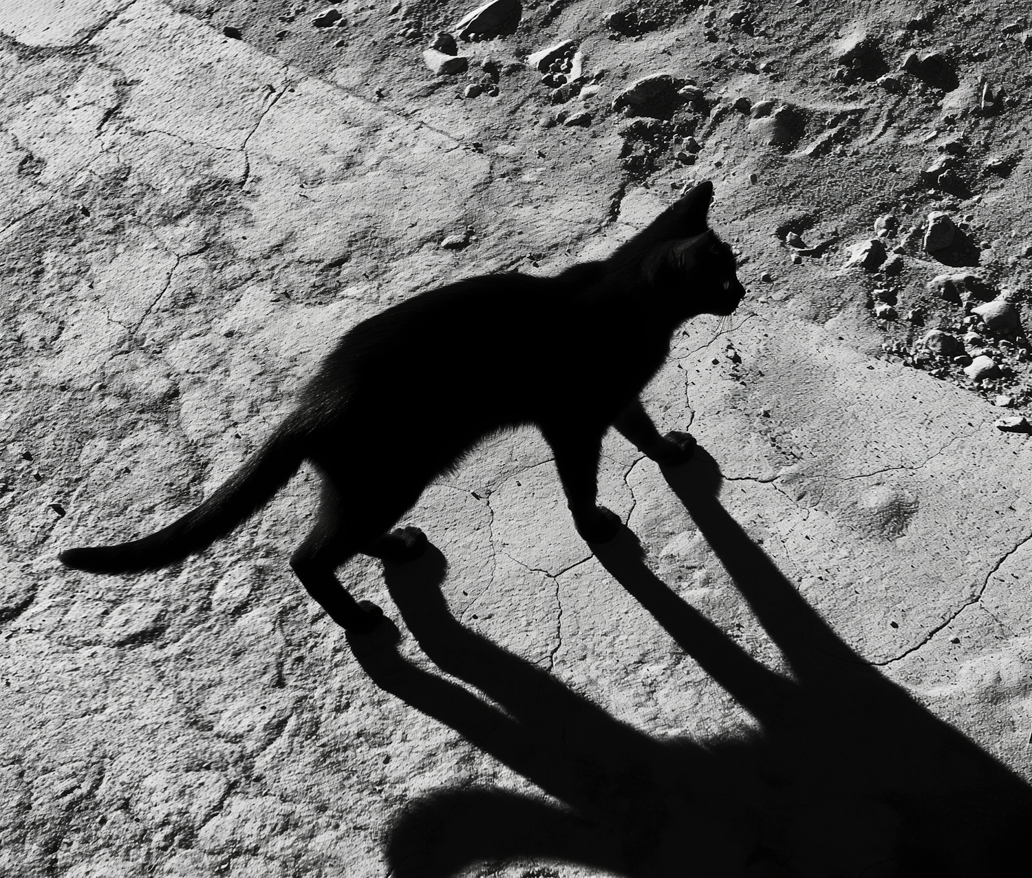 Black cat walking on a cracked surface, casting a long shadow in the sunlight. Monochromatic scene with dramatic contrast.