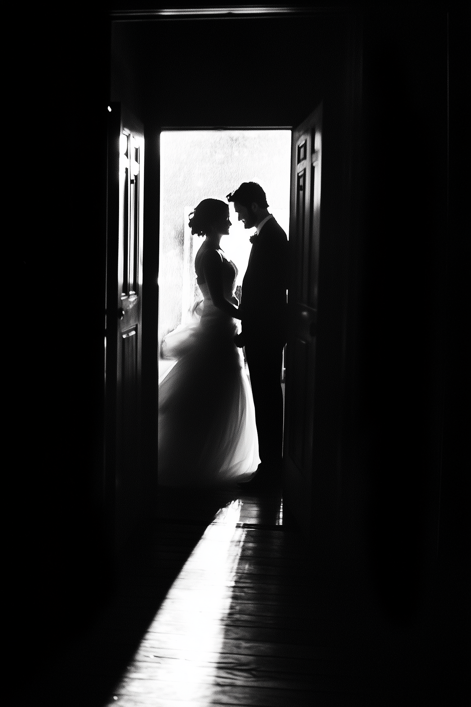 Romantic black and white silhouette of a couple in a doorway, creating an intimate and timeless scene.