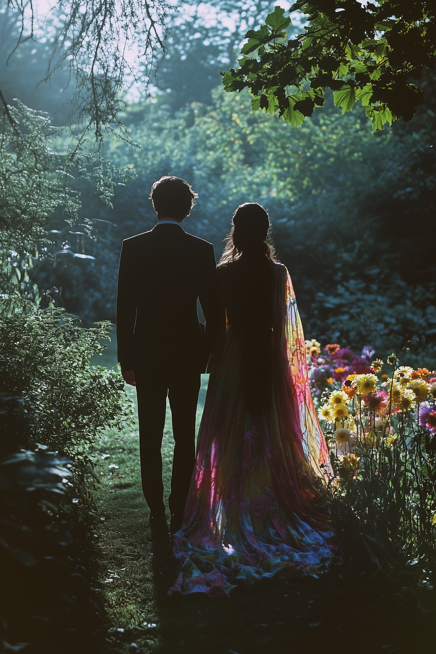 A couple stands hand in hand in a lush garden, silhouetted against vibrant flowers and greenery, creating a serene and romantic scene.