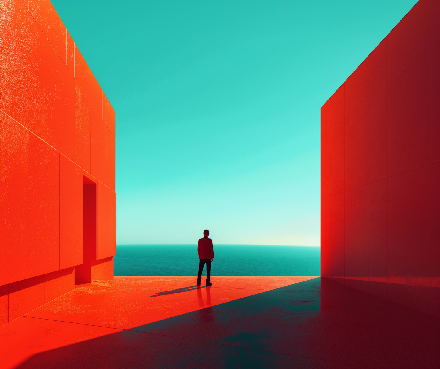 Minimalist scene of a man on a red platform between red walls, facing a turquoise sky and ocean. Striking contrast and geometric design.