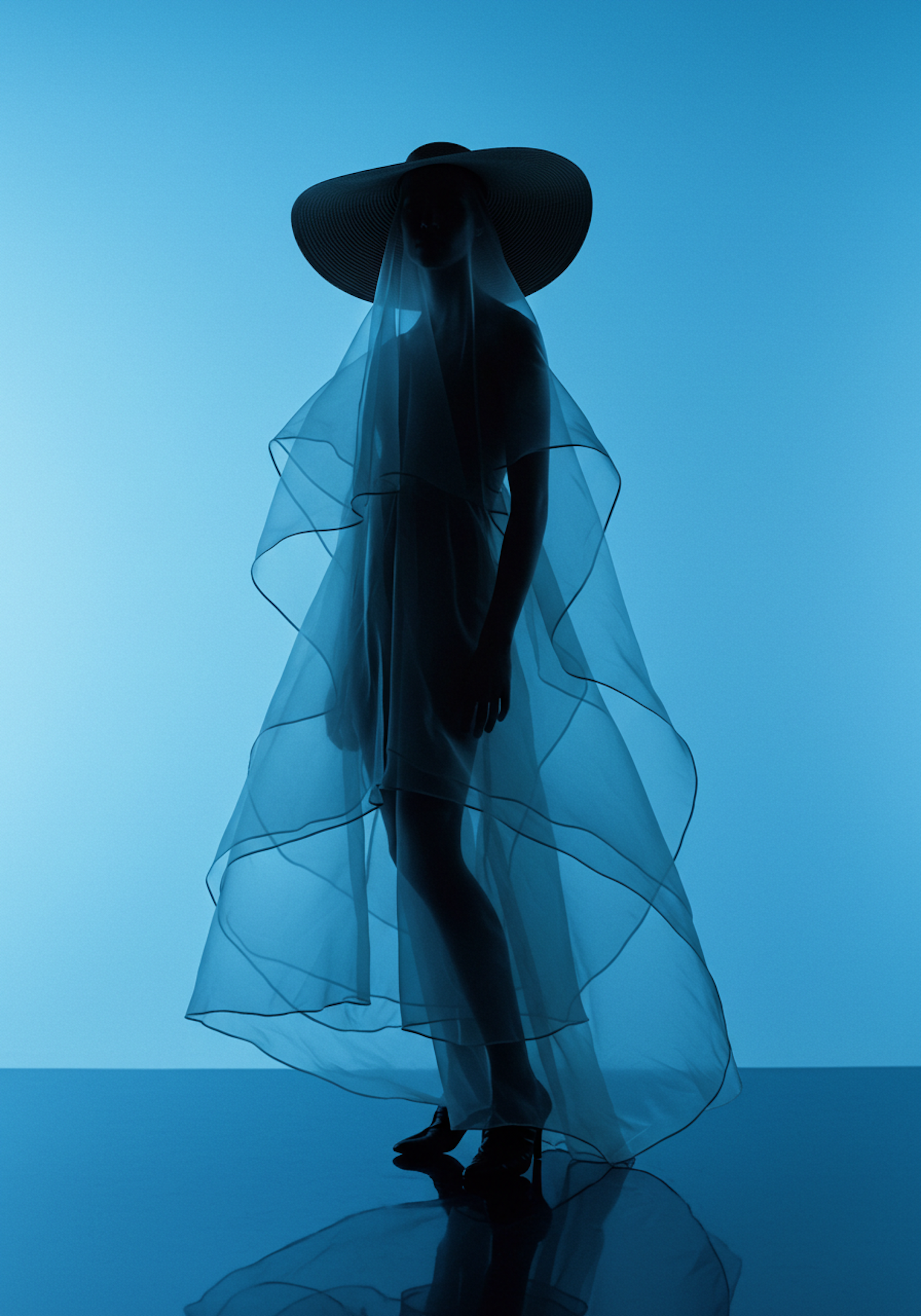 Silhouette of a person in a wide-brimmed hat and sheer fabric against a blue background, creating an ethereal and minimalist scene.