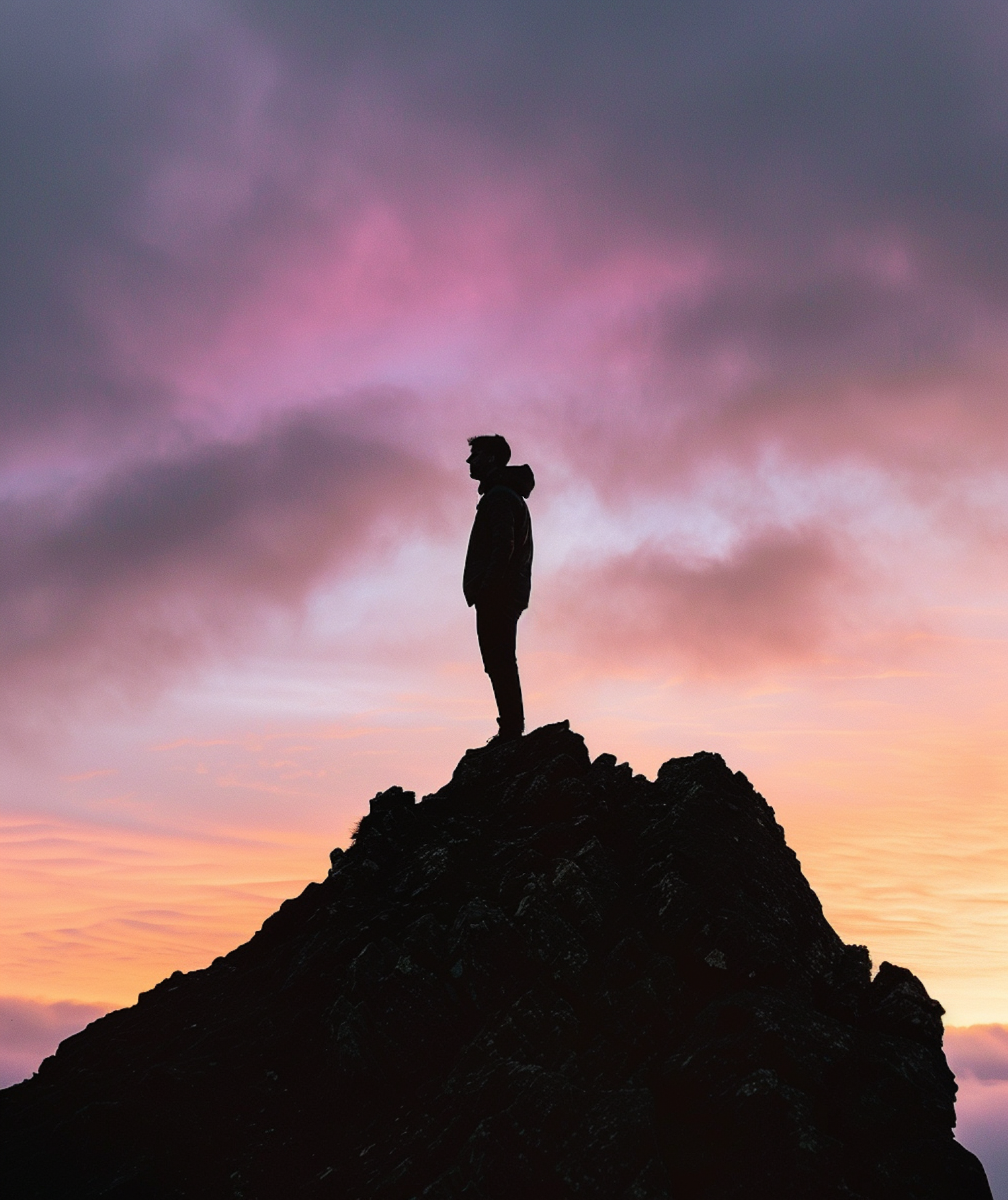 Silhouette of a person on a rocky peak against a vibrant sunset sky, evoking adventure and solitude.