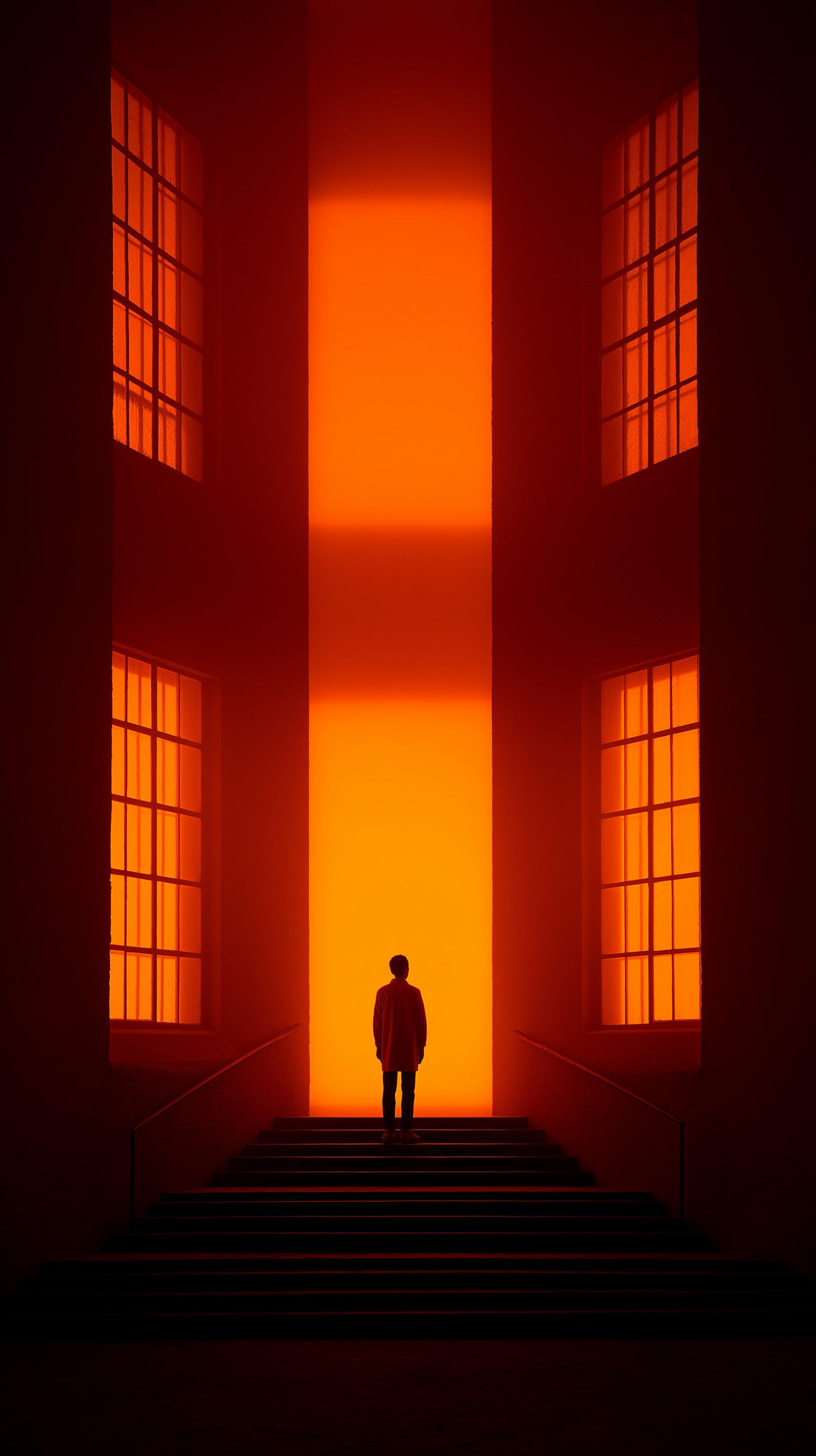 A silhouetted figure stands before a glowing orange light, framed by tall windows and a staircase, creating a dramatic and surreal scene.