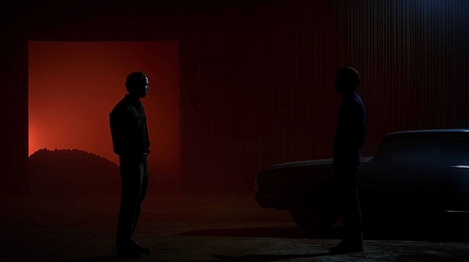 Silhouetted figures face off in a dimly lit, industrial setting with a glowing red backdrop and vintage car, creating a tense atmosphere.