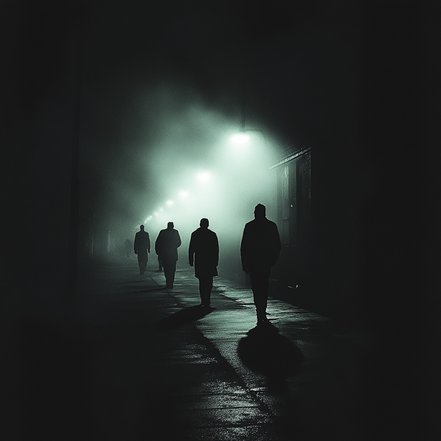 Silhouetted figures walk through a foggy, dimly lit street, creating a mysterious and eerie atmosphere.