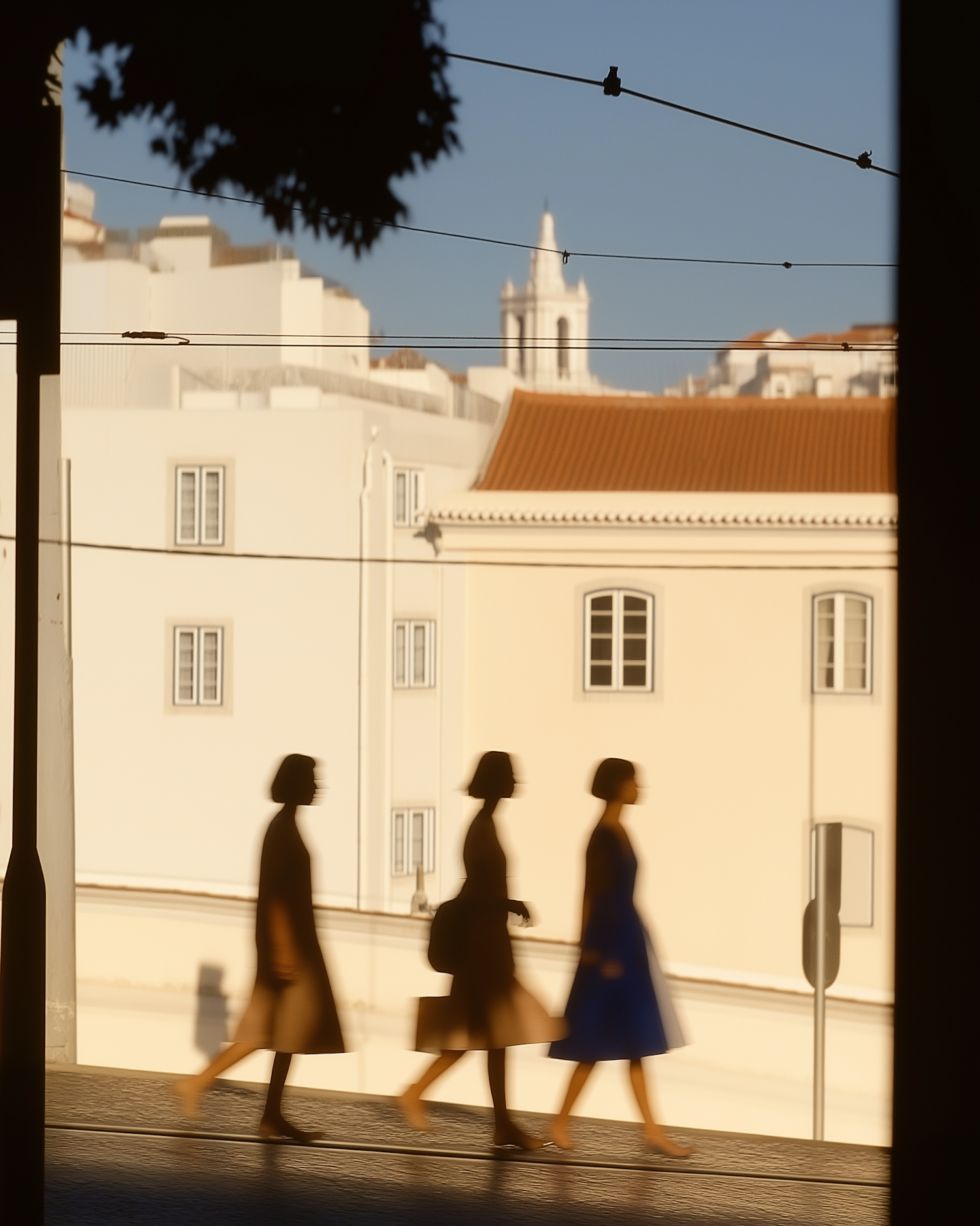 Silhouetted women walking in warm sunlight against a white building with a terracotta roof, capturing motion and light.