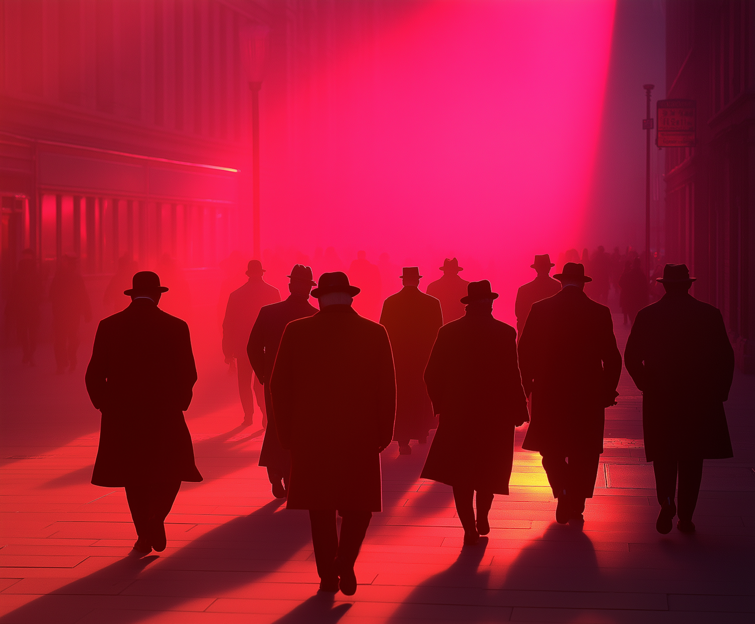 Silhouetted figures in coats and hats walk through a city street bathed in dramatic red light, creating a mysterious atmosphere.