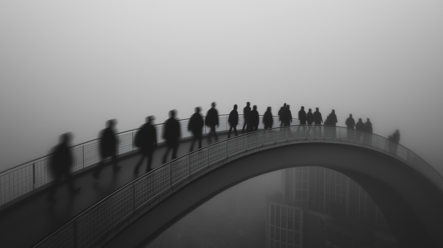 Silhouetted figures walk across a foggy, curved bridge, creating a mysterious and ethereal atmosphere in monochromatic tones.
