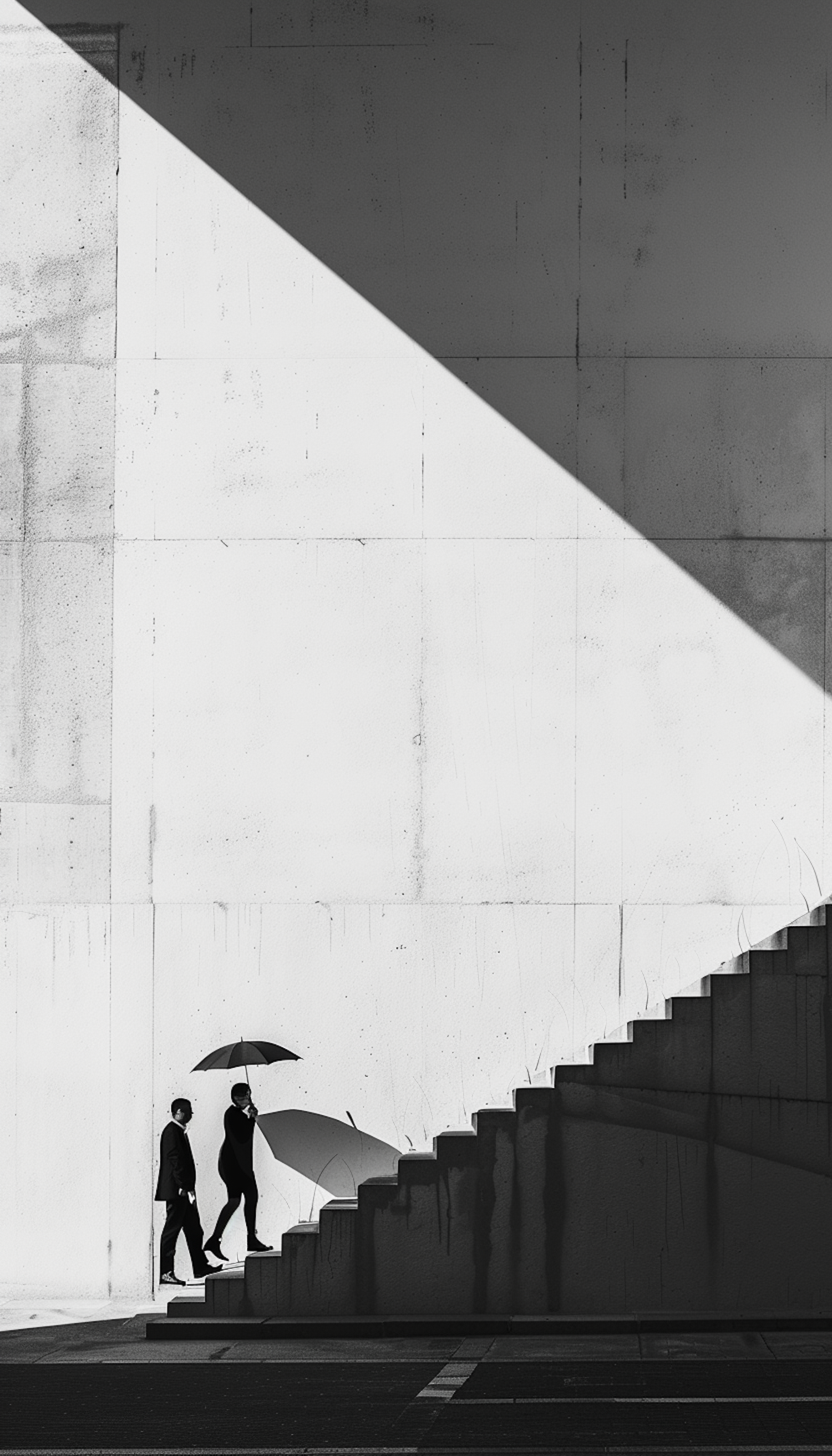 Black and white photo of two people walking up stairs, with dramatic shadows on a large white wall.