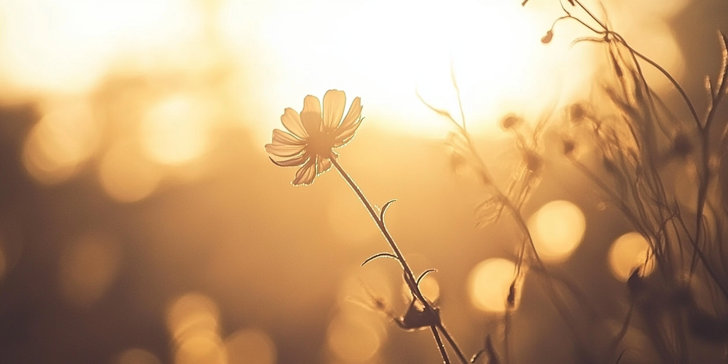 A single flower glows in warm golden light, surrounded by soft bokeh, creating a serene and dreamy atmosphere.