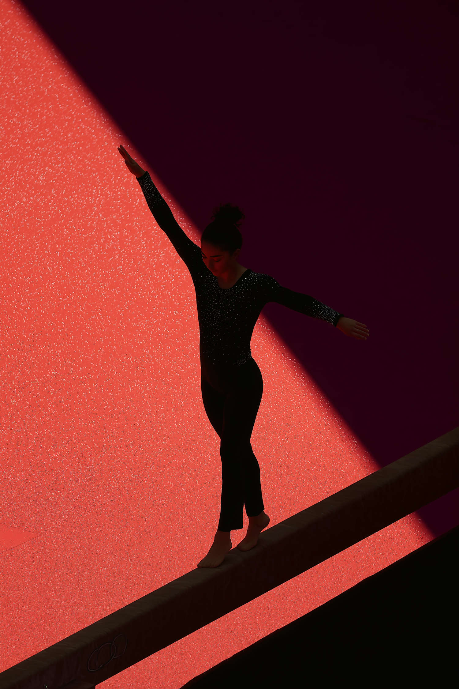 A gymnast in silhouette balances on a beam under dramatic lighting, set against a vibrant orange and dark maroon textured backdrop.