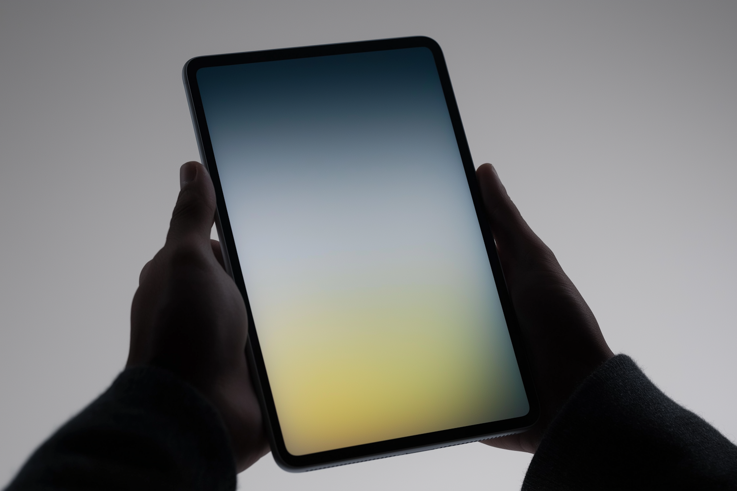 Silhouetted hands holding a tablet with a vibrant gradient screen against a neutral gray background.