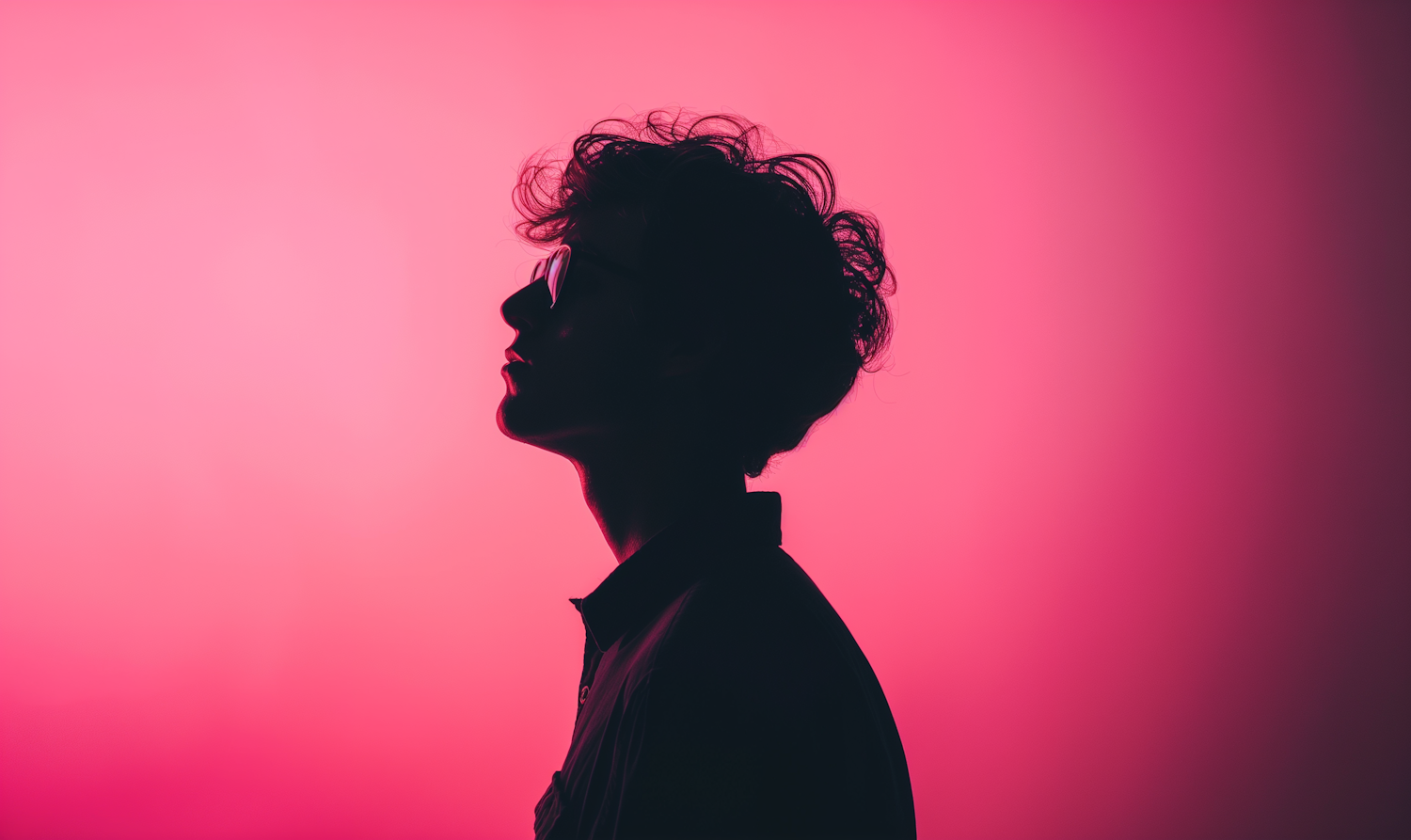 Silhouette of a person with curly hair and glasses against a vibrant pink background, creating a dramatic and artistic contrast.