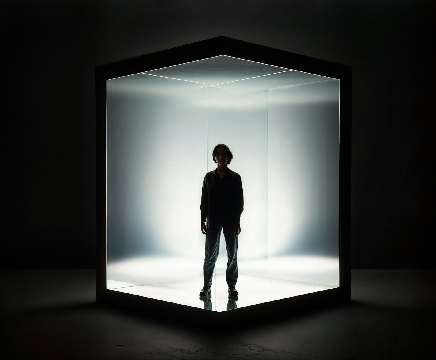 A person stands in a glowing glass cube against a dark background, creating a striking contrast and futuristic feel.
