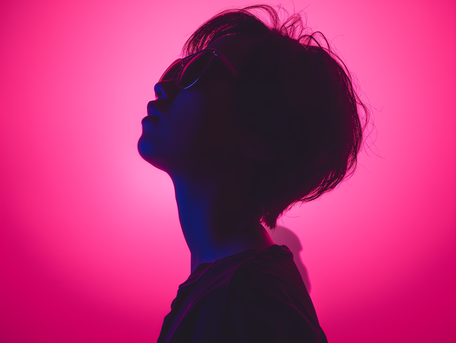 Silhouette of a person with sunglasses against a vibrant pink background, featuring bold lighting and a modern, edgy aesthetic.