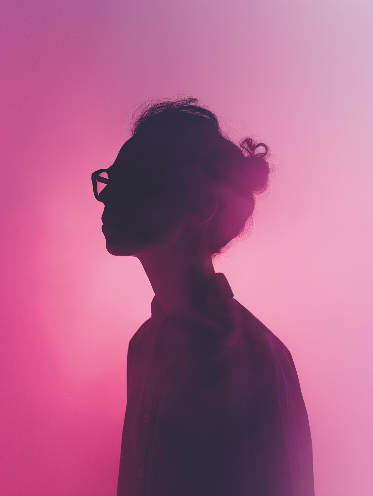 Silhouette of a person with glasses and a bun against a vibrant pink background, creating a dramatic and artistic effect.