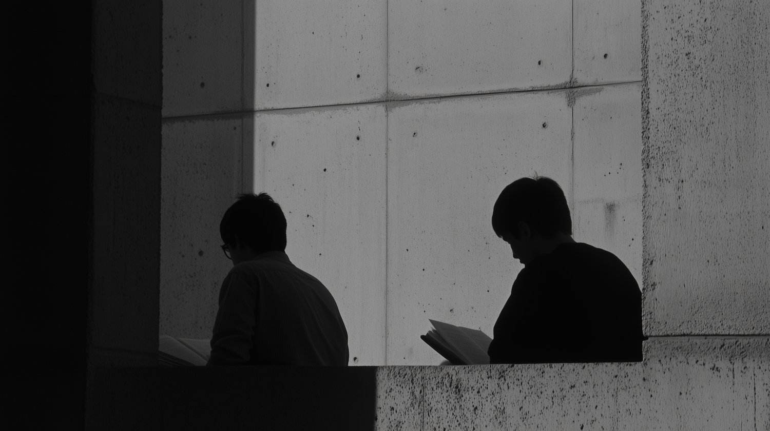 Silhouetted figures reading against a concrete wall, captured in dramatic black and white contrast.