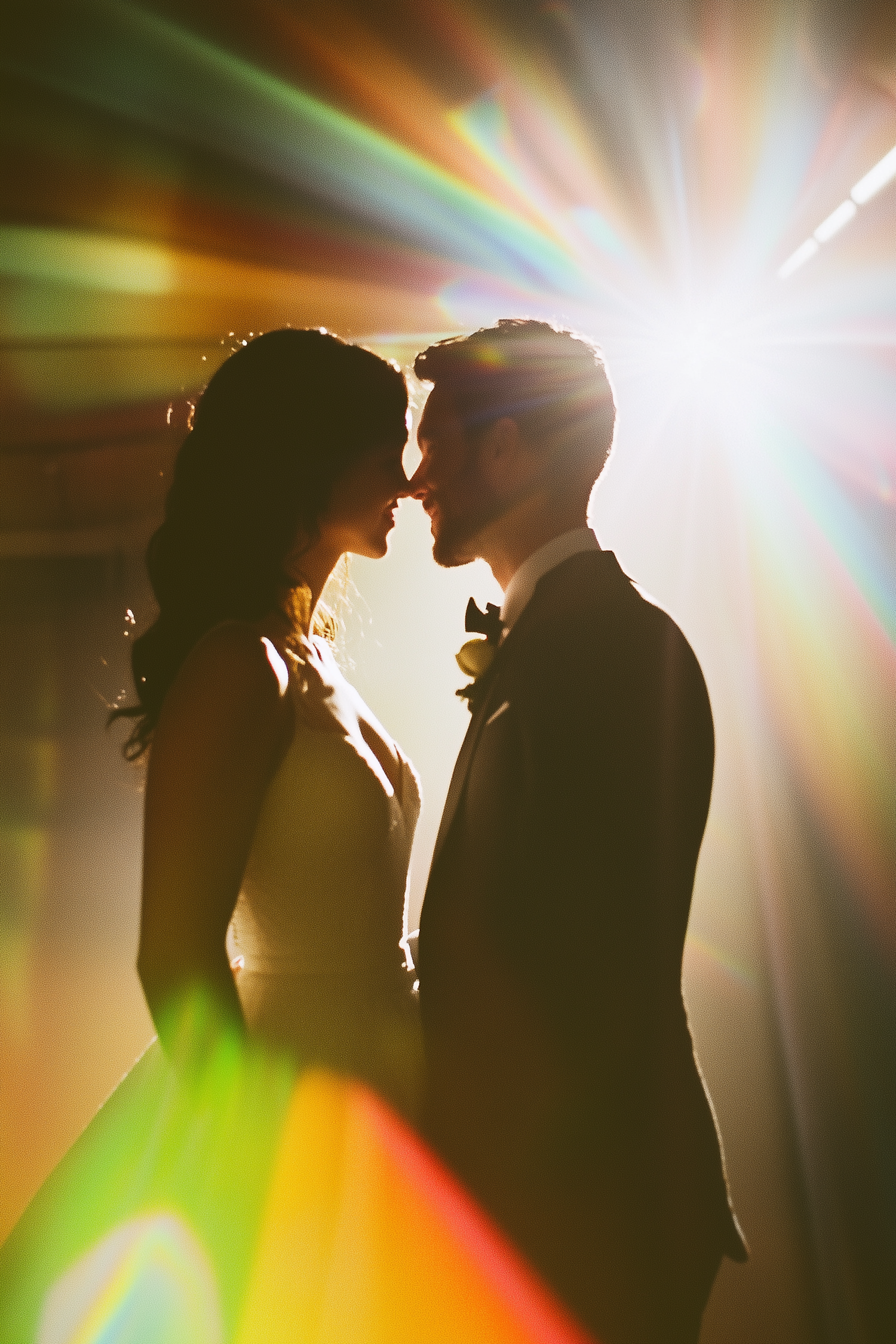 Silhouetted couple in a romantic embrace with radiant light and colorful rays creating a dreamy atmosphere.