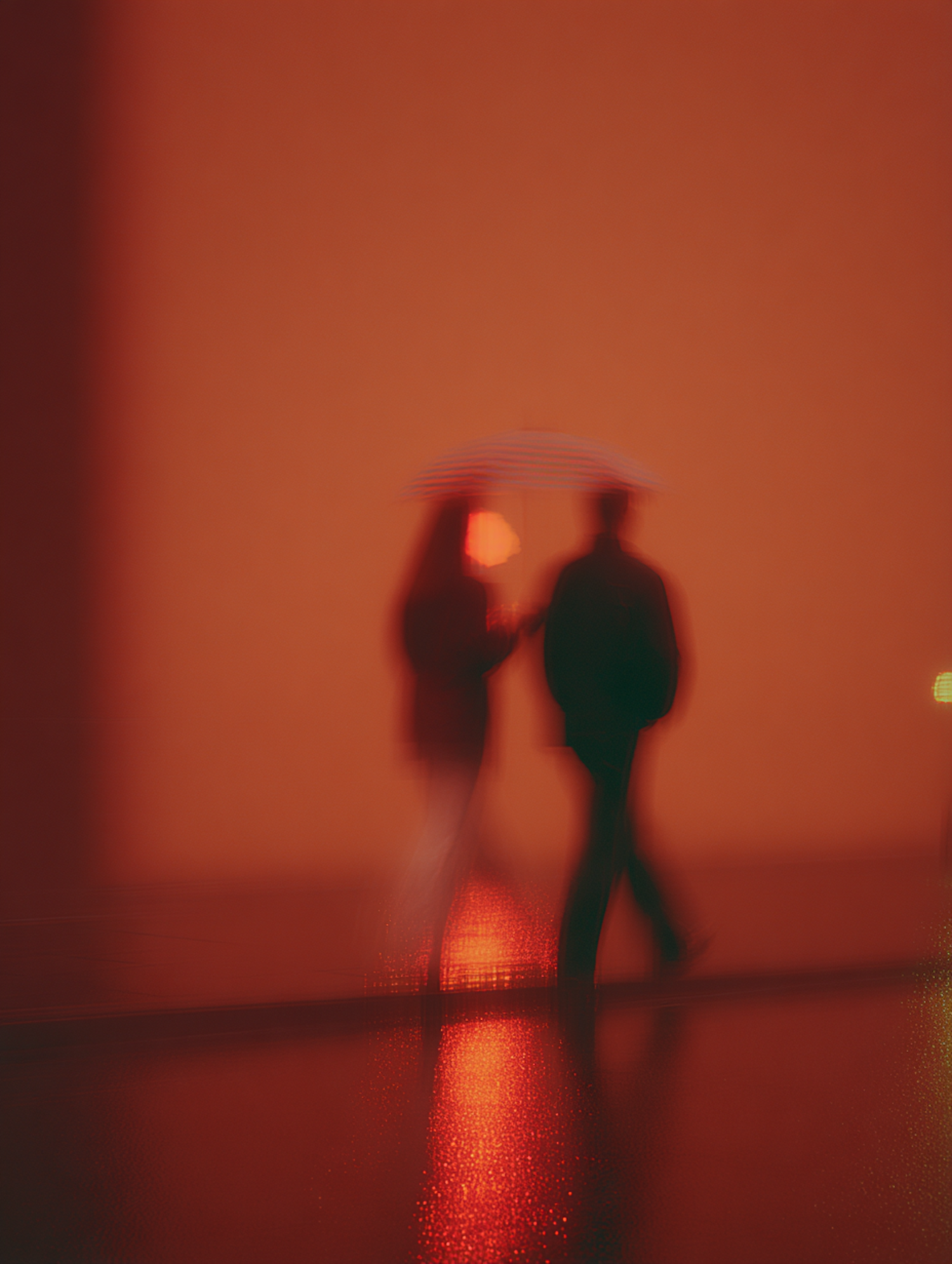 A blurred, atmospheric scene of two people walking under a striped umbrella, set against a warm orange-red background with reflective wet ground.