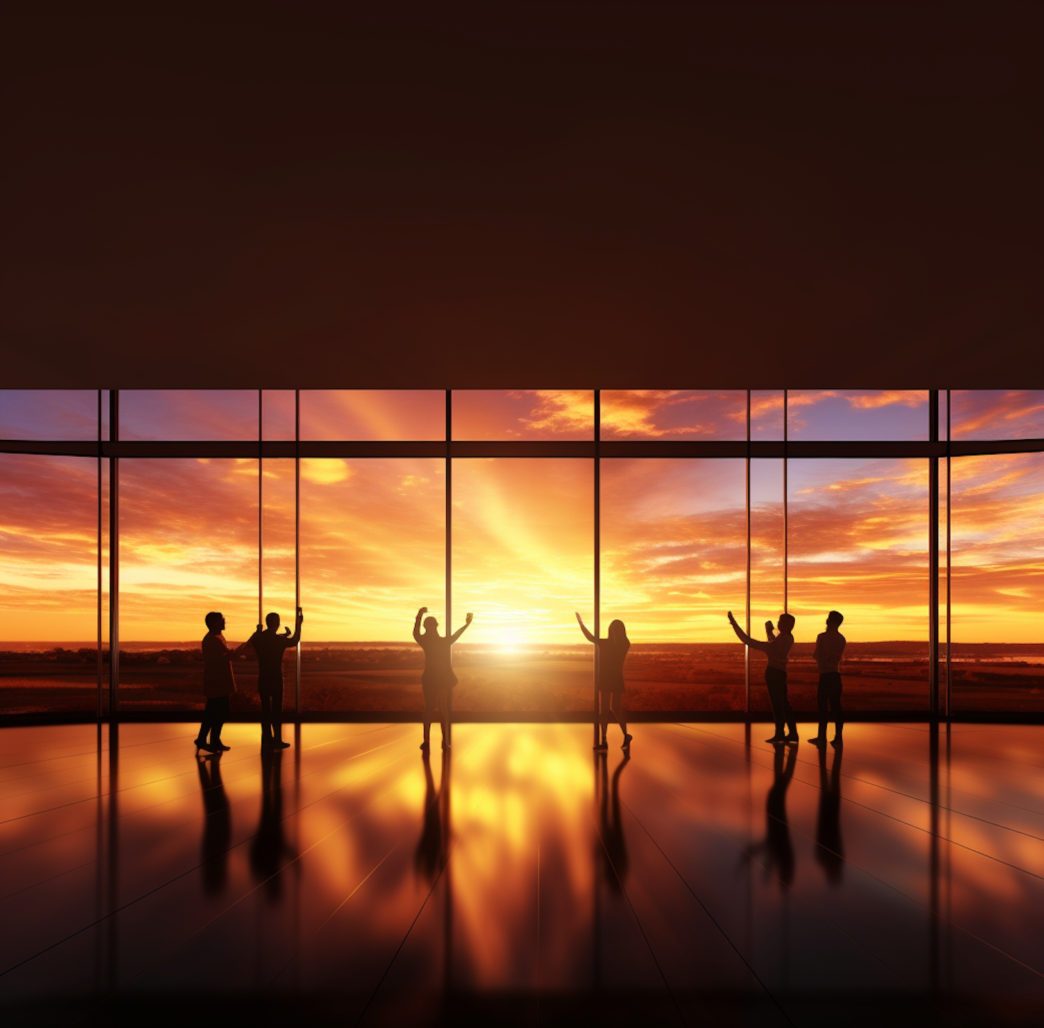 Silhouetted figures admire a stunning sunset through a large window, with vibrant colors reflecting on the floor.