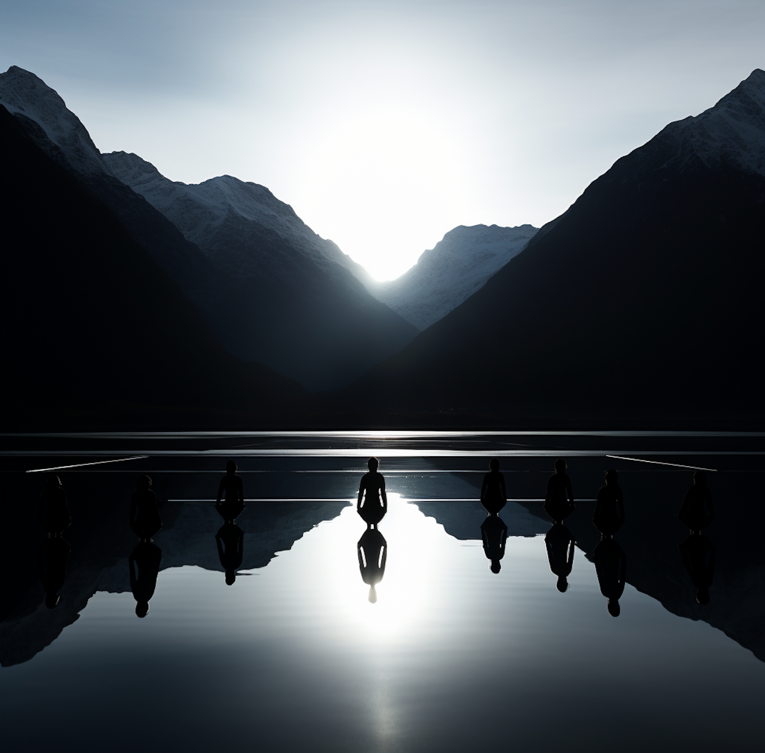 Silhouetted figures meditate on a reflective water surface with majestic mountains and a glowing sun in the background.