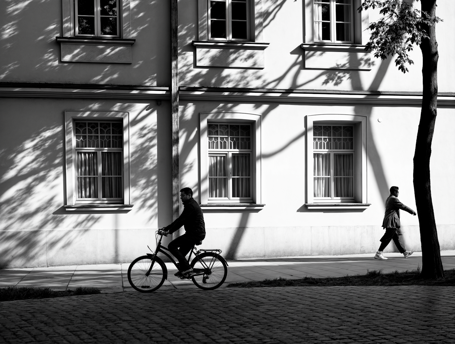 Black and white photo of a cyclist and pedestrian against a building with tree shadows. Urban scene with light and shadow play.