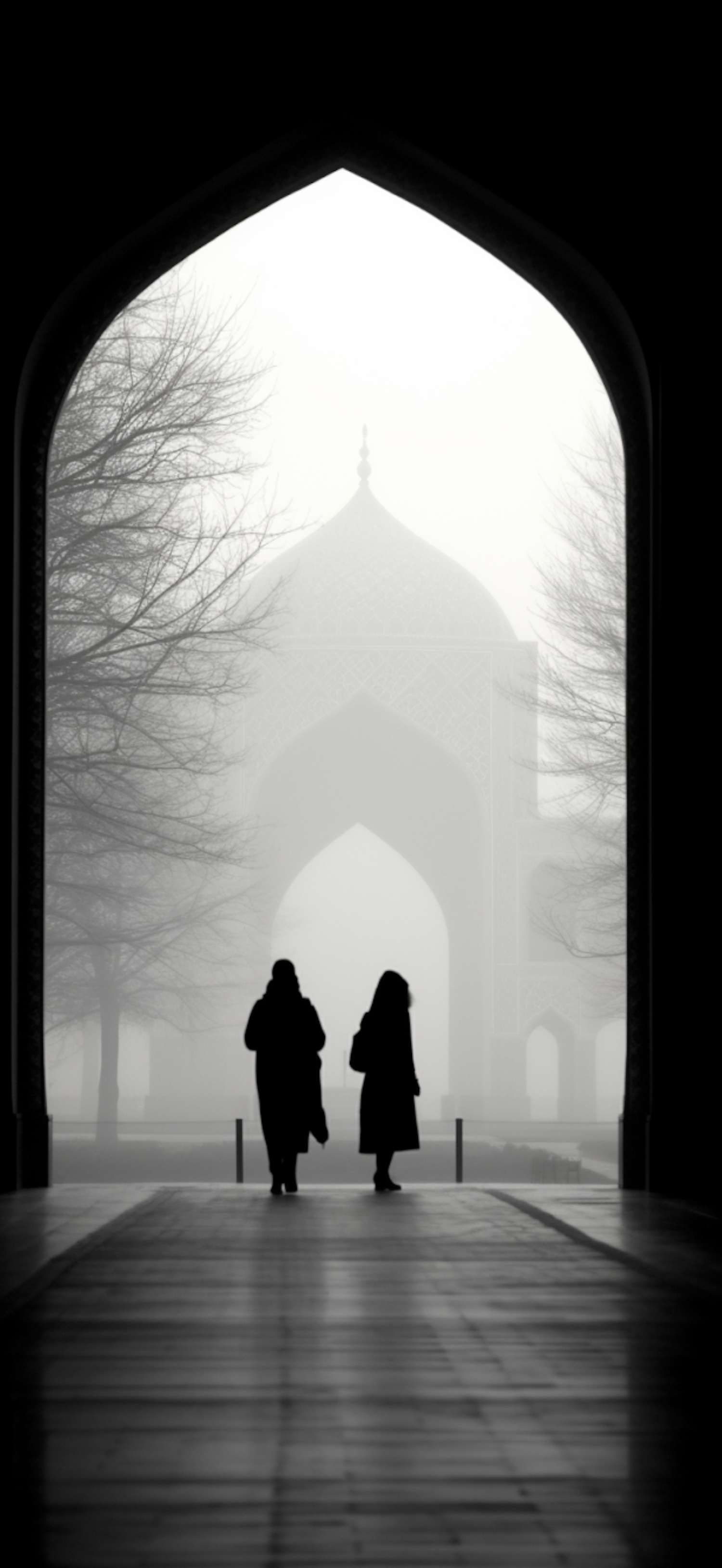 Silhouetted figures under a grand archway in a misty setting, with a domed structure in the background, creating a serene atmosphere.
