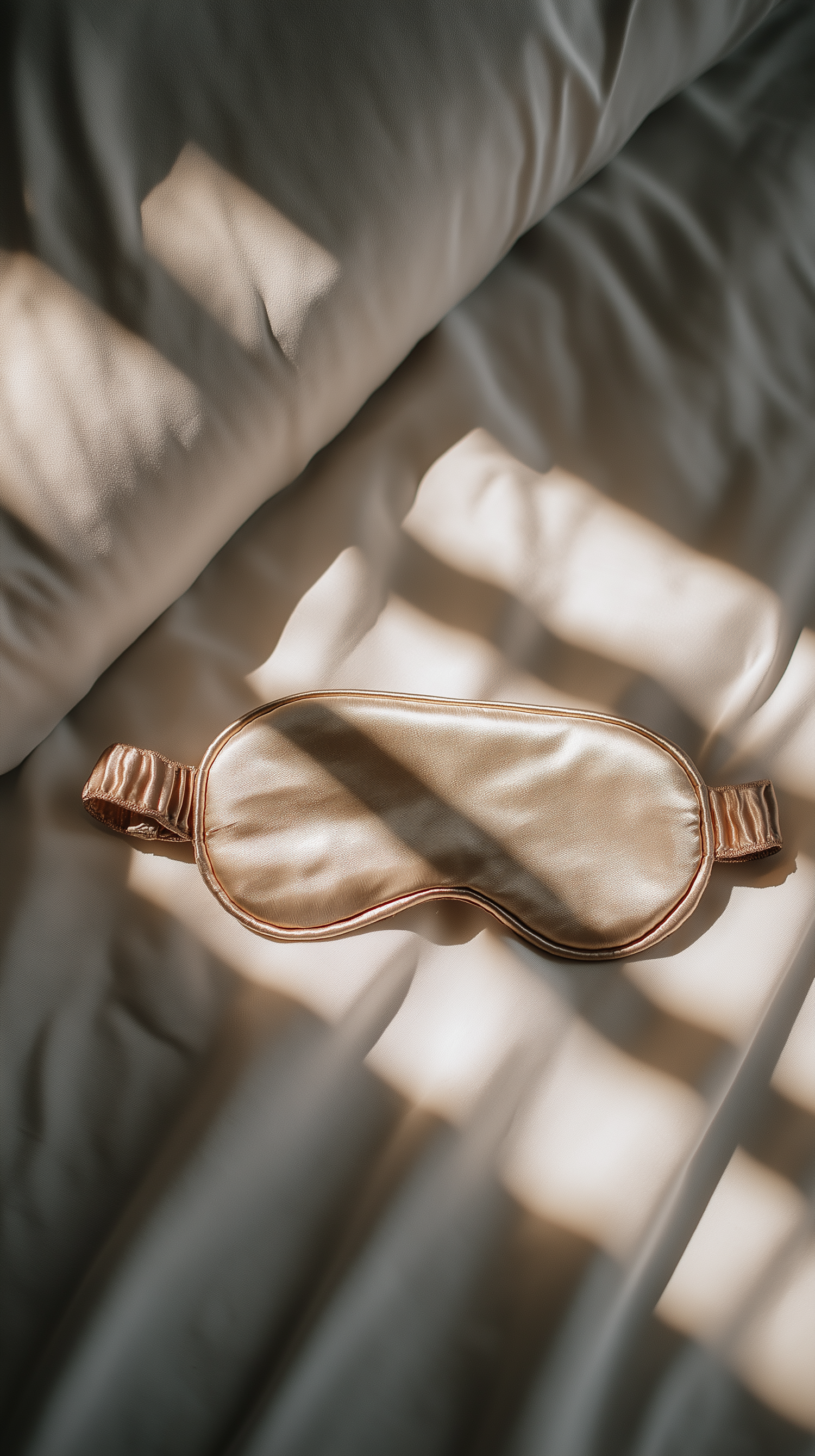 A beige silk sleep mask on a white bed, bathed in soft natural light, creating a serene and relaxing atmosphere.
