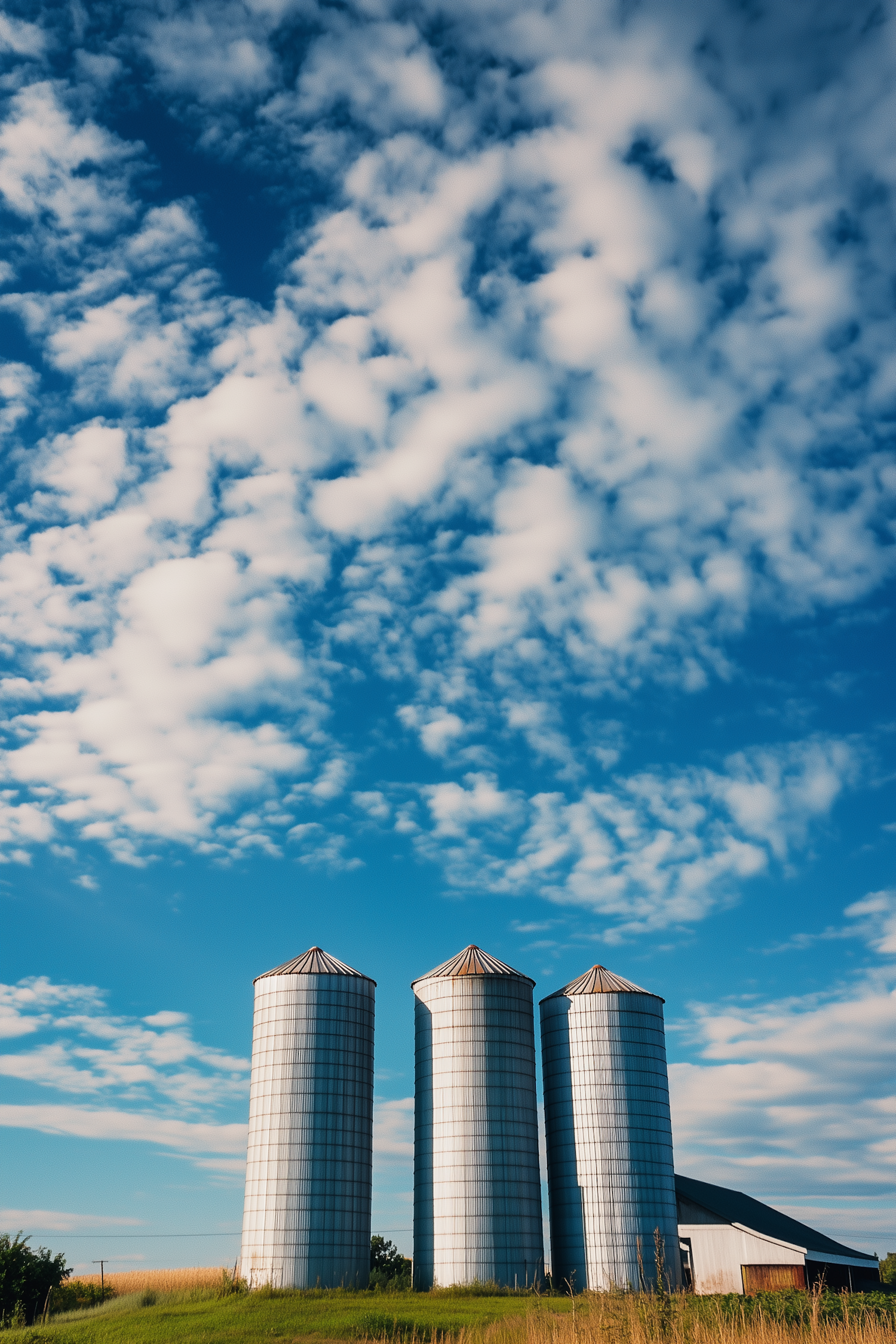 Three metallic silos on a grassy hill under a bright blue sky with scattered clouds, next to a white barn. A serene rural landscape.