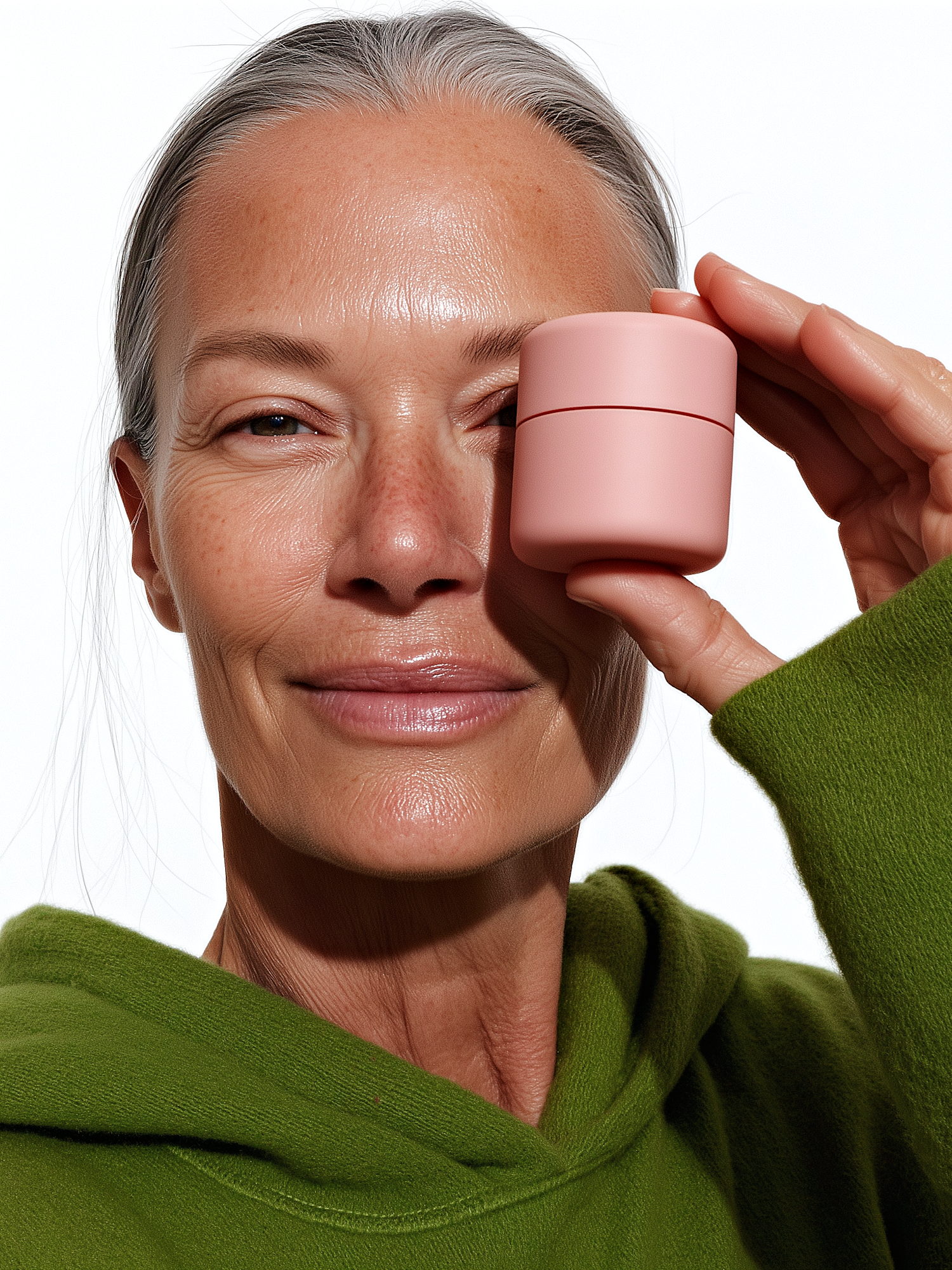 A mature person with silver hair holds a pink container, wearing a green hoodie against a white background, showcasing natural beauty.