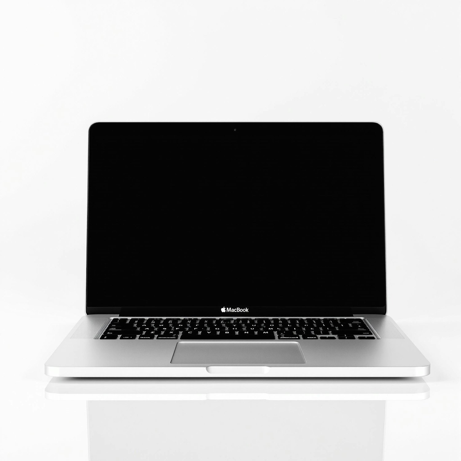 Silver laptop with black screen on a reflective white surface, ideal for tech and productivity themes.
