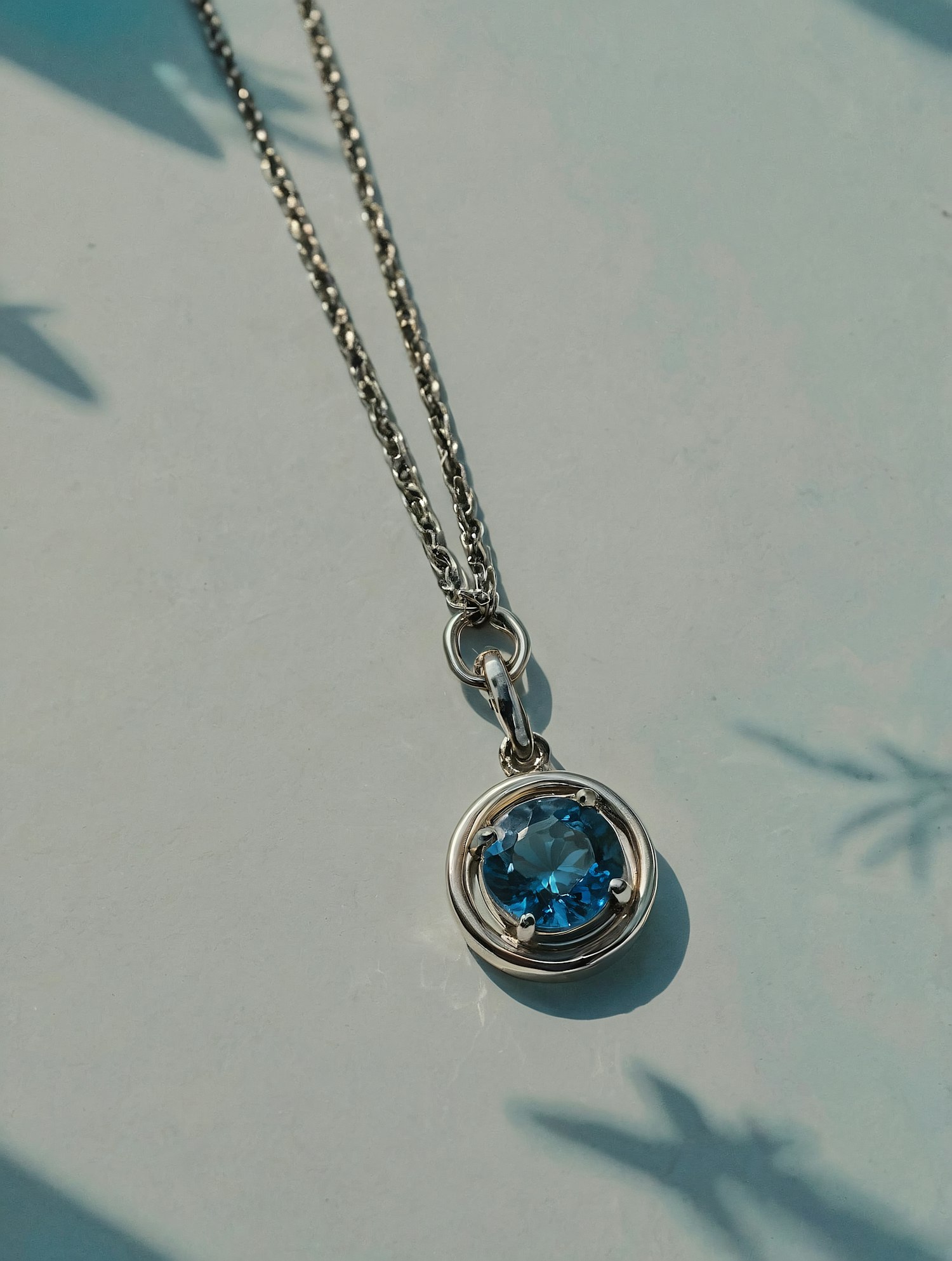 Elegant silver necklace with a blue gemstone pendant, beautifully reflecting light. Perfect for adding a touch of sophistication.