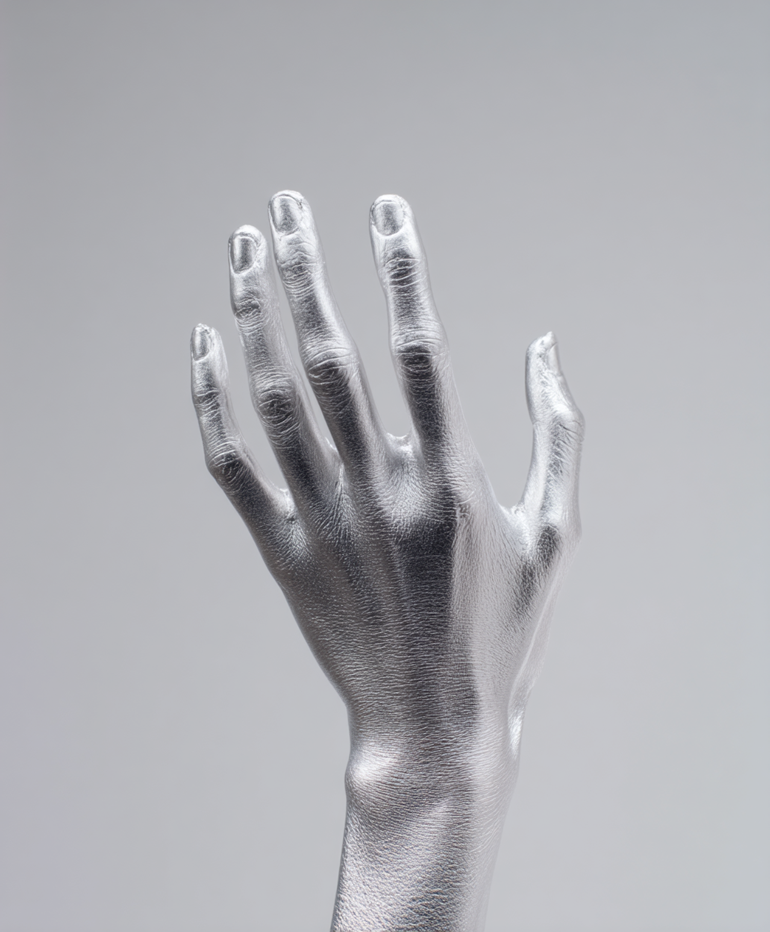 A metallic silver-painted hand reaching upward against a plain gray background, showcasing a futuristic and artistic vibe.