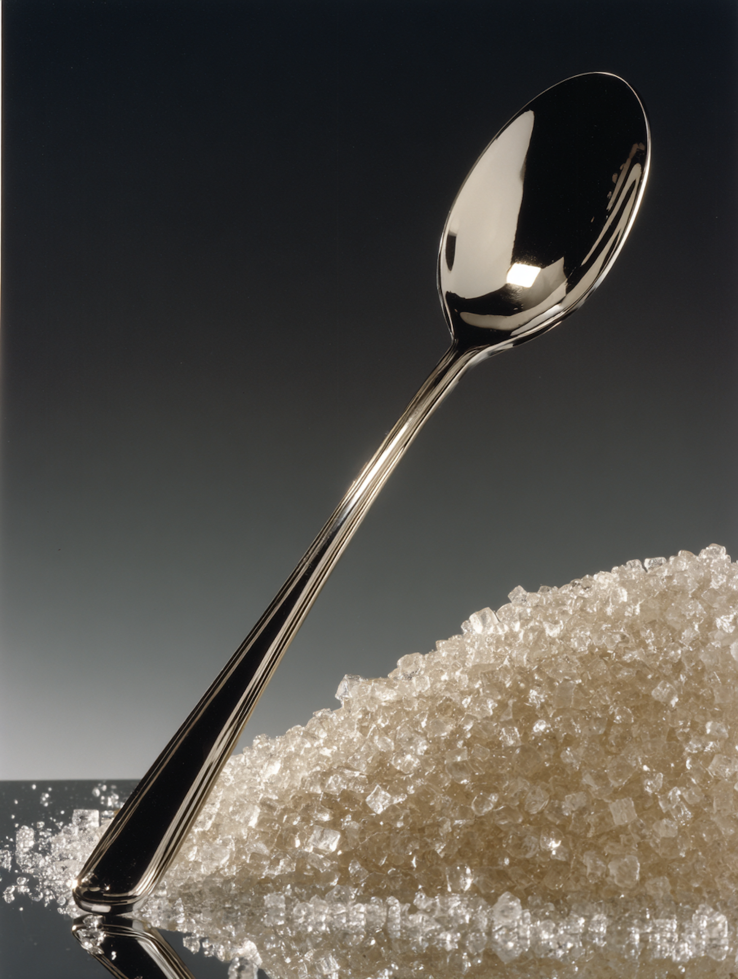 A shiny silver spoon stands upright beside a pile of sparkling sugar crystals, set against a dark gradient background.