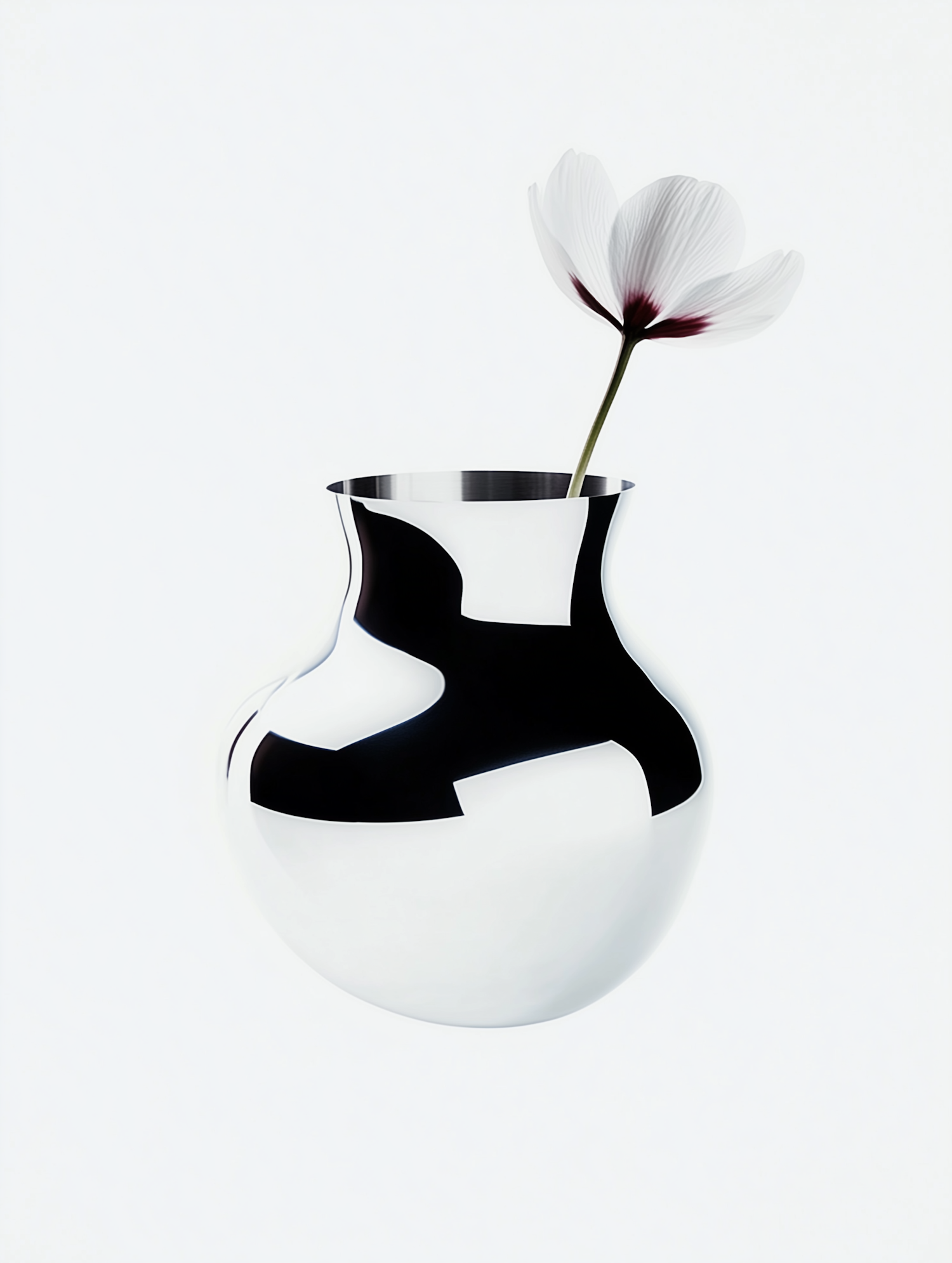 Minimalist silver vase with a single white flower against a white background, showcasing elegance and simplicity.