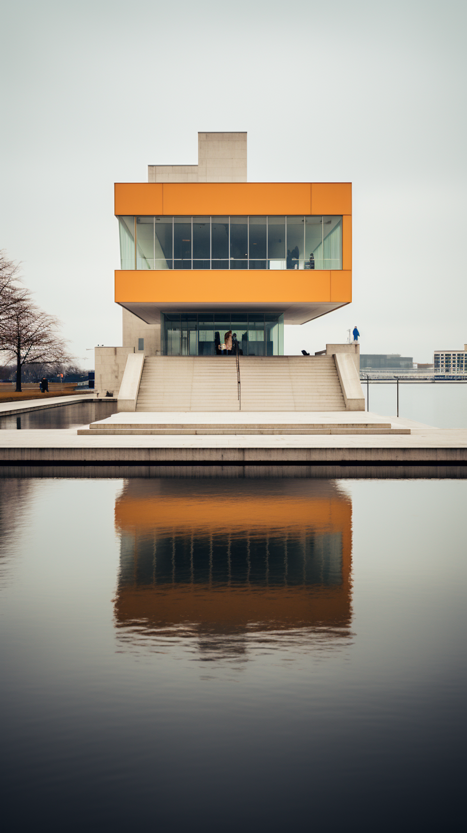 Modern building with orange facade and glass windows reflected in water, creating a symmetrical and striking architectural scene.